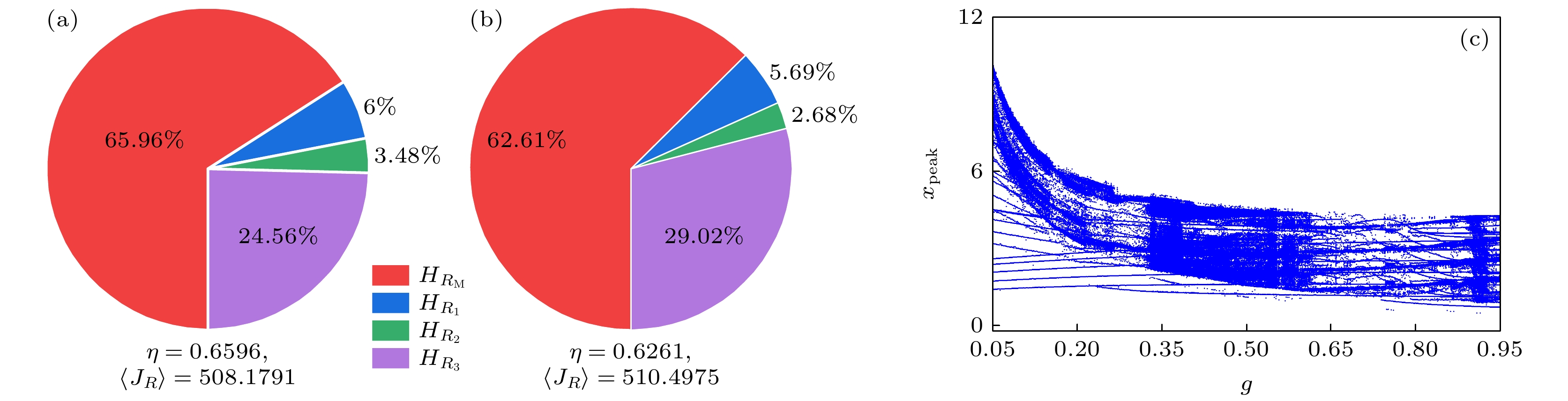 图 13 神经元工作过程中分别处于(a) 周期放电b = 0.991和(b) 混沌放电b = 0.928时, 电阻R1, R2和R3对应的能量消耗占比情况; (c) b = 1.72时变量x的峰值xpeak对参数g的分岔图