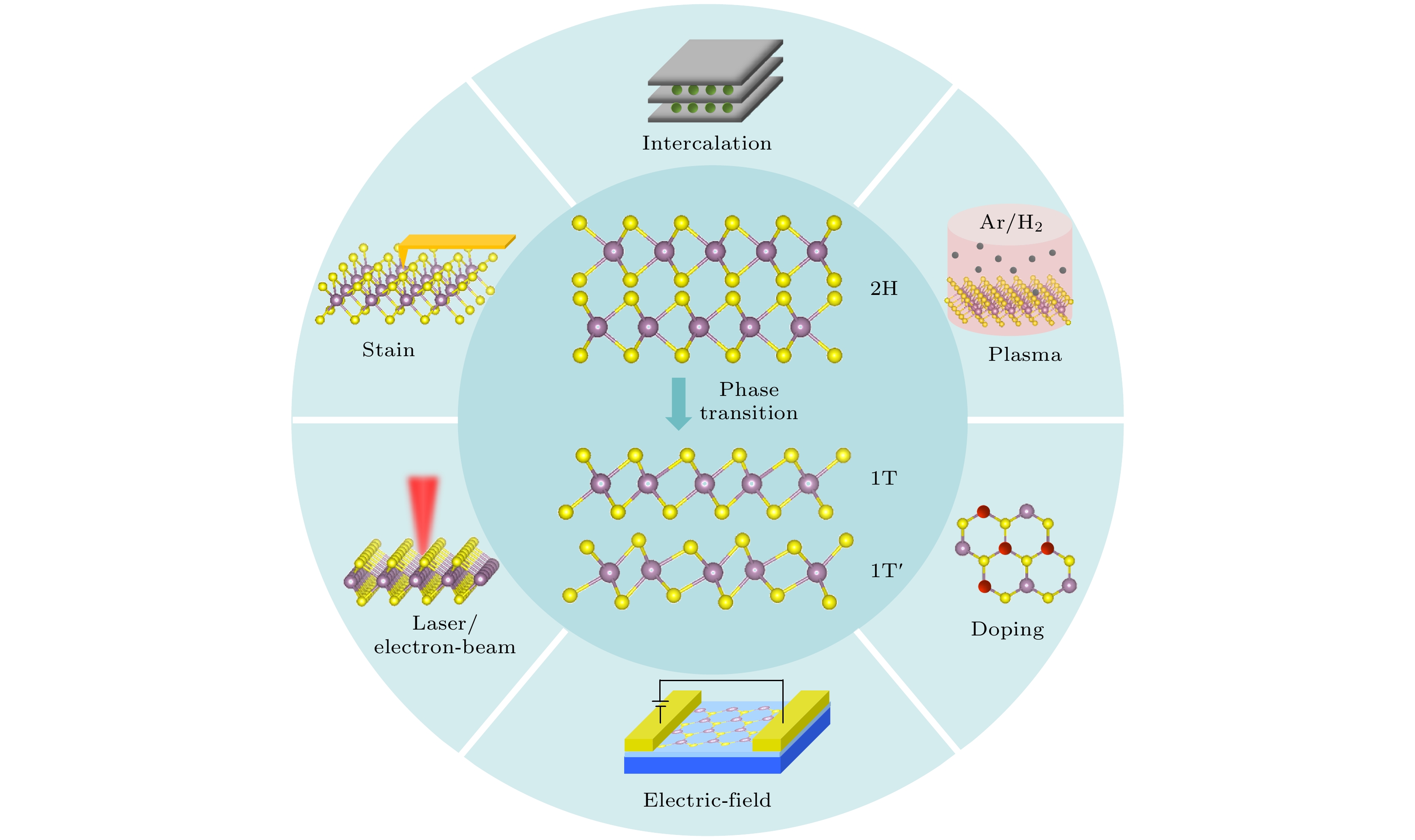 Fig. 2. (a) Electrostatic force microscopy (EFM) image showing the localized 2H-to-1T' phase transition in MoS2 induced by alkali metal intercalation[52] (reproduced with permission from Ref.[52]); (b) strain-controlled reversible switching between the 2H and 1T' phases in MoTe2, accompanied by a semiconductor-to-metal transition[55]; (c) laser-induced selective 2H-to-1T' phase transition in MoTe2 (reproduced with permission from Ref.[56]); (d) electric-field-driven 2H-to-1T' phase transition (reproduced with permission from Ref.[58]); (e) electron-beam irradiation-induced 2H-to-1T phase transition in MoS2 (reproduced with permission from Ref.[59]); (f) transition from the H phase to the T' phase in MoS2 achieved by doping with different concentrations of Re atoms (reproduced with permission from Ref.[60]).