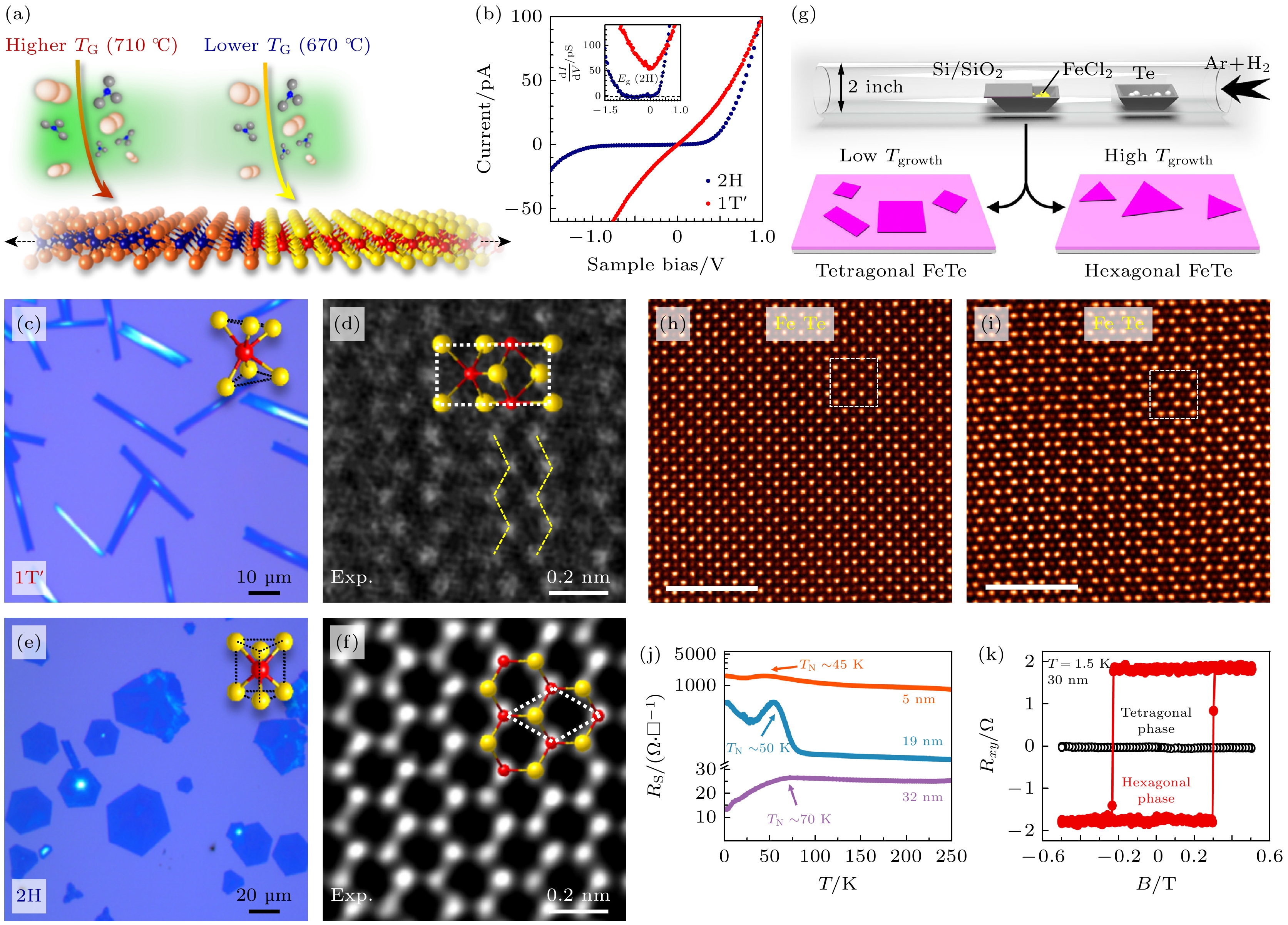 Fig. 4. (a) Sequential growth scheme for coplanar heteroepitaxy of 1T'-MoTe2 polycrystals; (b) STS I-V curves of 2H-MoTe2 and 1T'-MoTe2 crystals; (c) optical microscope image of a single-faceted 1T'-MoTe2 crystal; (d) high-magnification HAADF-STEM image of monolayer 1T'-MoTe2 obtained via the multilayer method, with corresponding unit cell illustration; (e) optical microscope image of a hexagonal 2H-MoTe2 crystal; (f) high-magnification HAADF-STEM image of few-layer 2H-MoTe2 with unit cell illustration (reproduced with permission from Ref.[67]); (g) schematic of the FeTe growth process; (h), (i) STEM-ADF images of tetragonal and hexagonal FeTe crystals; (j) temperature dependence of in-plane resistivity for tetragonal FeTe devices with varying thicknesses; (k) field-dependent Hall resistance of tetragonal and hexagonal FeTe at 1.5 K[71].