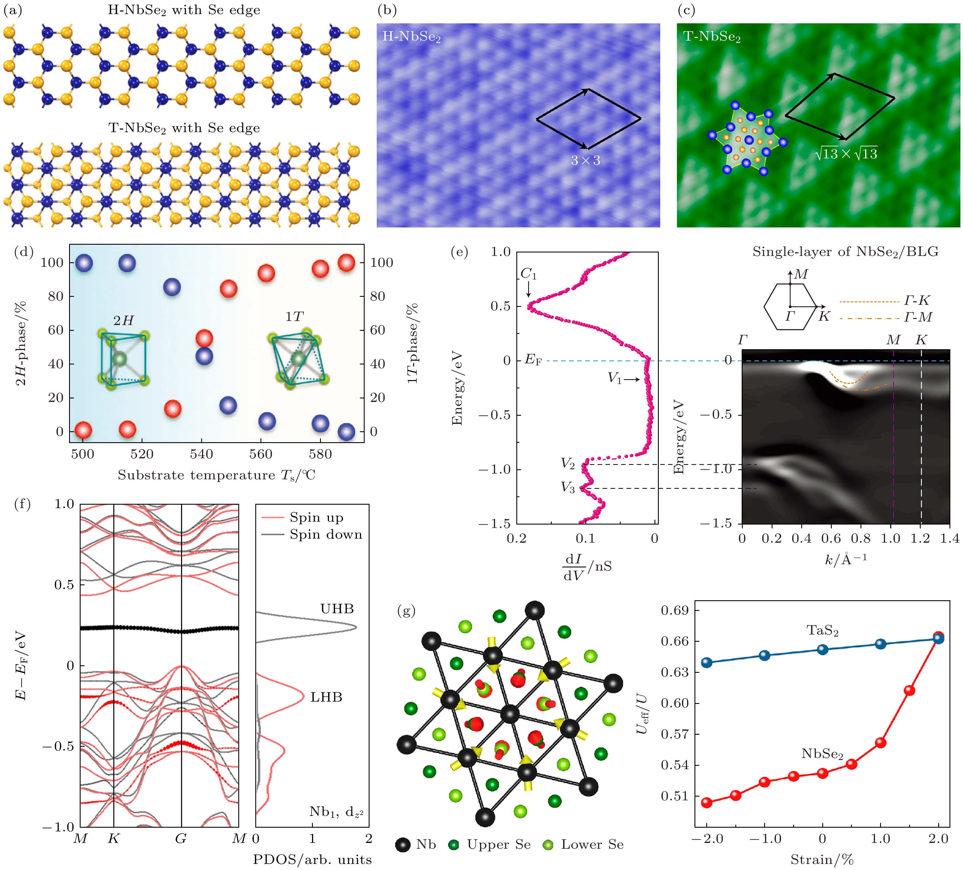 图 5 (a) H-NbSe2和T-NbSe2晶体结构模型; (b) H-NbSe2的STM图像; (c) T-NbSe2的STM图像(出自文献[77], 已获得授权); (d) 1T/2H相比例随生长温度的演变关系[78]; (e) 单层NbSe2/BLG体系的dI/dV谱(左)与ARPES能谱(右)(出自文献[79], 已获得授权); (f) 第一性原理计算的1T-NbSe2 SOD晶胞电子结构(左)及PDOS分布(右); (g) 暗态到亮态转变过程中近邻Nb和Se原子的晶格畸变及单层1T-NbSe2的库仑能随应变的变化关系(出自文献[80], 已获得授权)