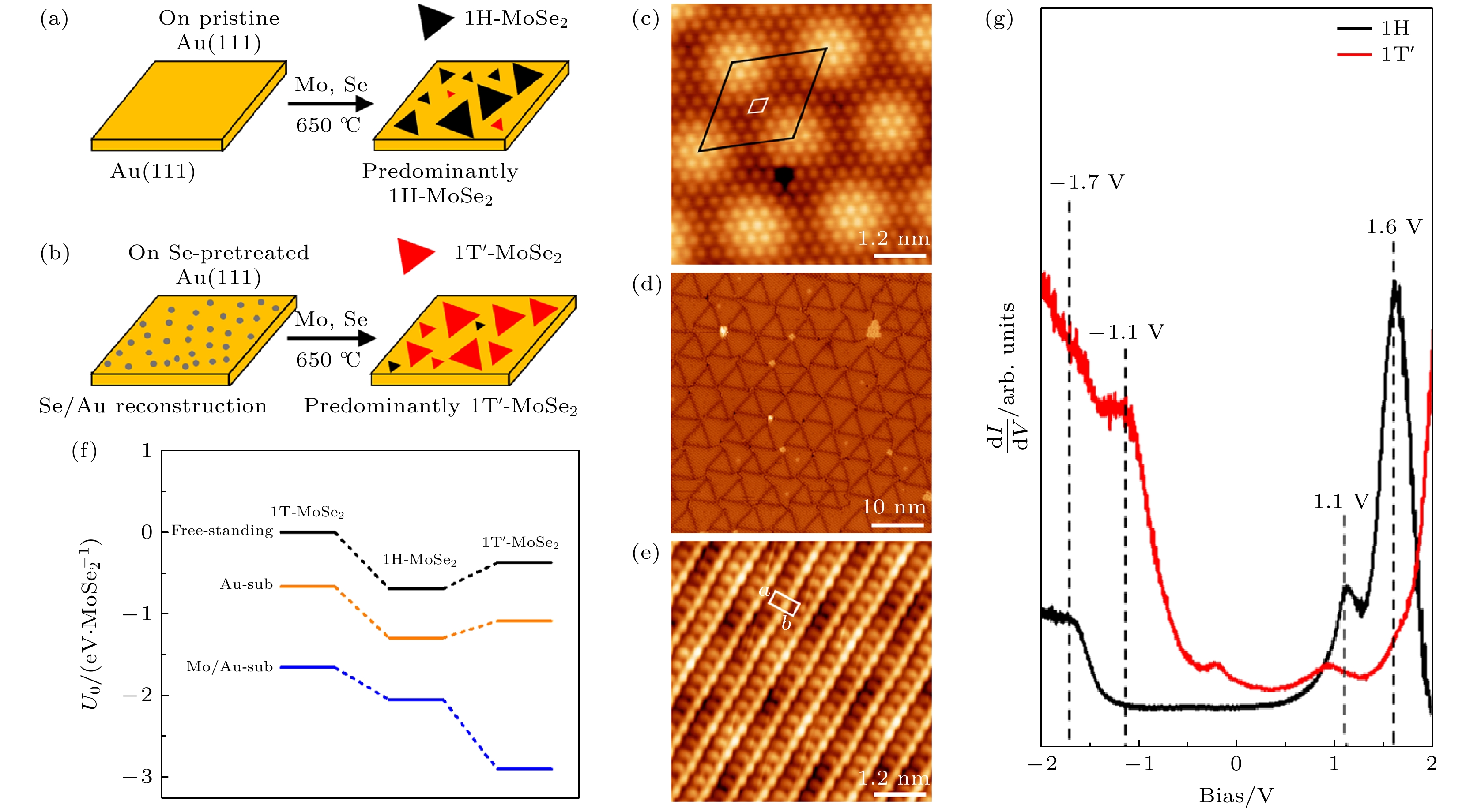 Fig. 8. (a), (b) Schematic illustration of phase-controlled growth of MoSe2 on Au(111); (c) atomic-resolution STM images of 1 H-MoSe2 grown on pristine Au(111); (d) the STM images of Se-pretreated Au(111); (e) atomic-resolution STM images of 1T'-MoSe2 grown on Se-pretreated Au(111); (f) relative energy of 1T-, 1H-, and 1T'-MoSe2 on Au(111) and Mo/Au(111) substrates; (g) STS acquired on the 1H- and 1T'-MoSe2 (reproduced with permission from Ref.[87]).