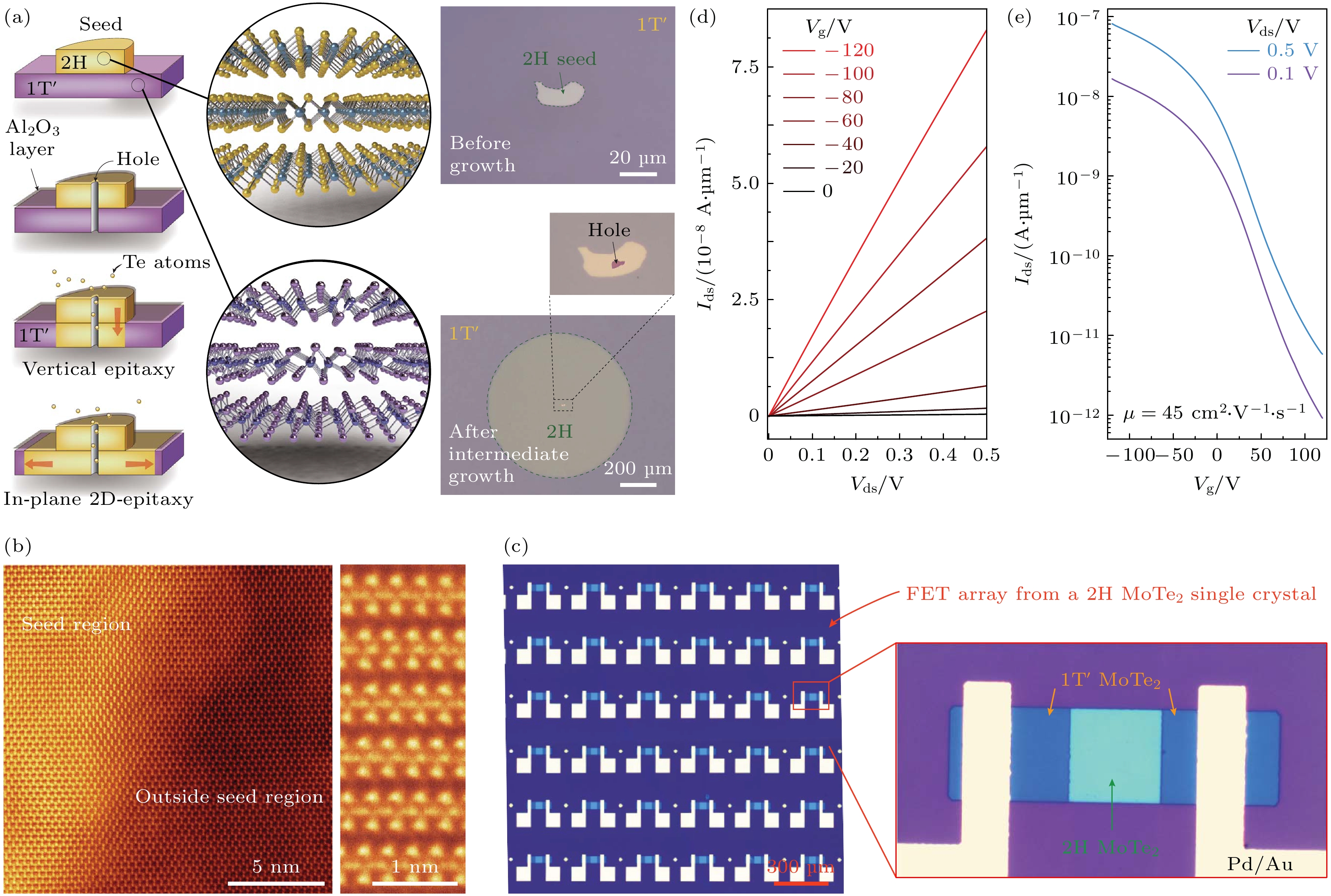 Fig. 9. (a) Schematic diagrams for the in-plane 2D-epitaxy synthesis of wafer-scale single-crystalline 2H MoTe2 thin film; (b) HAADF-STEM image around the edge of the 2H MoTe2 seed and cross-sectional HAADF-STEM image of the epitaxial 2H MoTe2 film; (c) optical image of the 1T'/2H/1T' MoTe2 FET array; (d) typical Ids-Vds curves of FET measured under various gate voltages; (e) typical transfer curves of the FET (reproduced with permission from Ref.[50]).