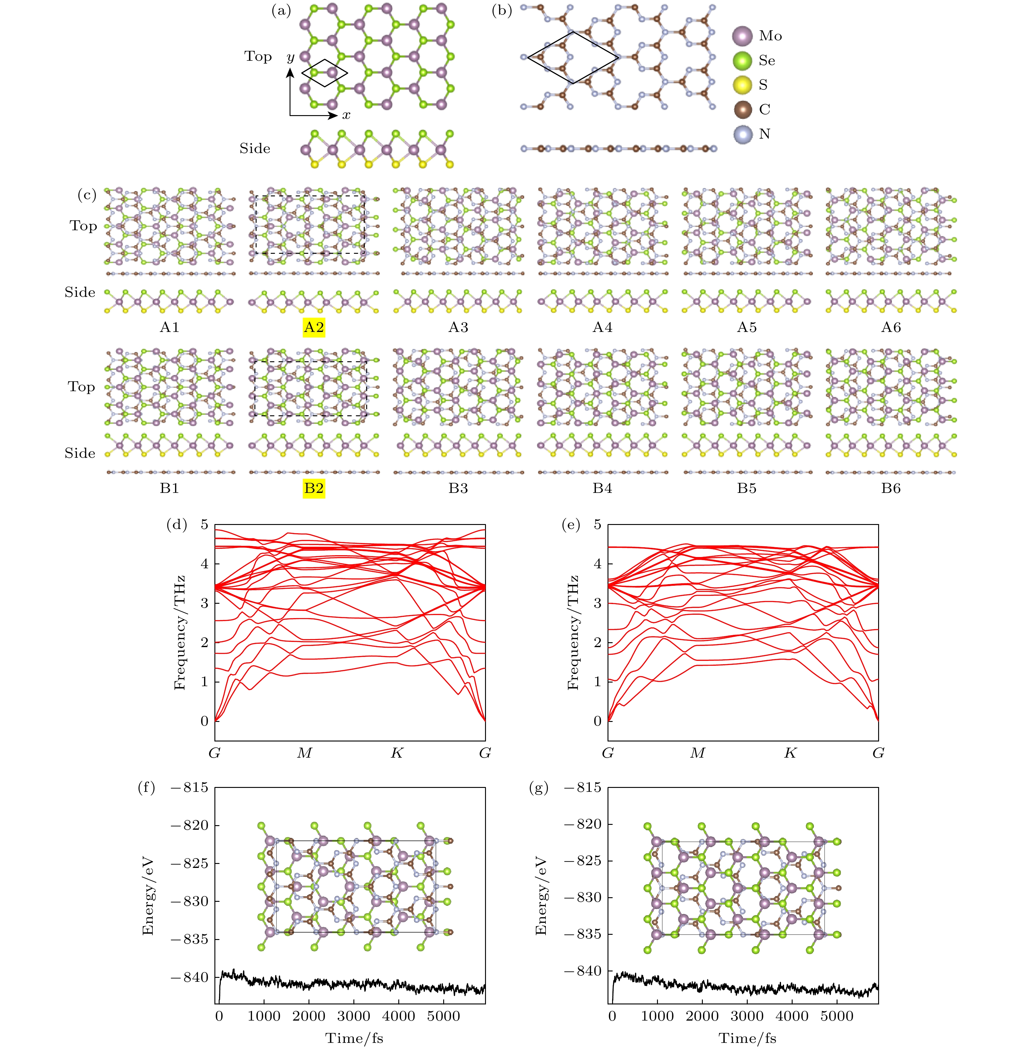 图 1 (a) 单层MoSSe和(b) g-C3N4的俯视图和侧视图. 黑色框为MoSSe和g-C3N4的单胞结构; (c) SMoSe/C3N4(A1—A6)和SeMoS/ g-C3N4(B1—B6)不同堆叠构型的俯视图和侧视图, 其中A2—A6, B2—B6分别由A1, B1以60°间隔依次顺时针旋转MoSSe层得到的异质结构(黑色虚线框内为最小超胞, A2和B2上的阴影突出了结合能最低的堆叠构型); (d) A2与(e) B2异质结构声子谱; (f) A2与(g) B2异质结构AIMD模拟的能量变化