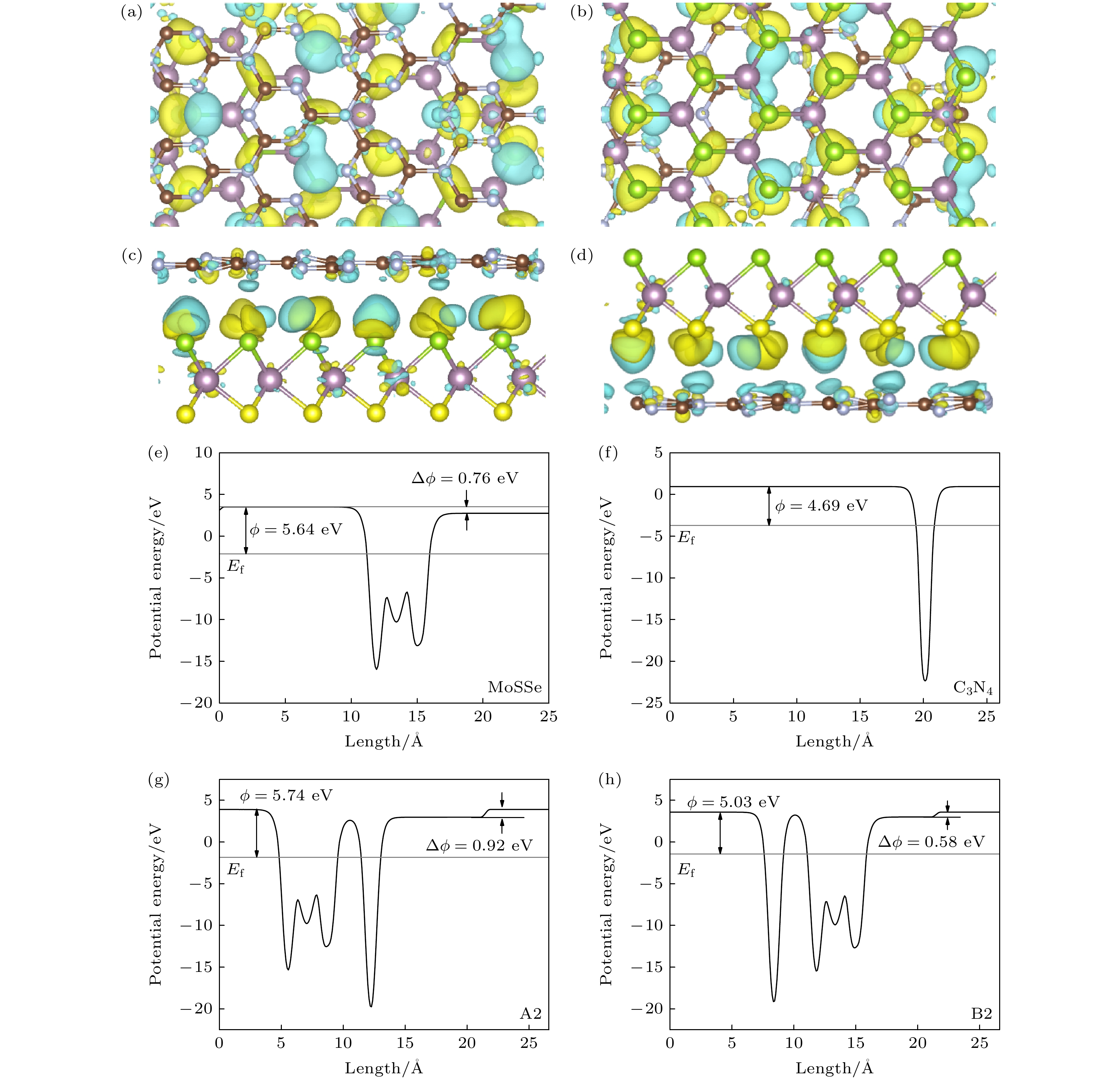 Fig. 3. Differential charge density diagrams for (a) top view and (c) side view of A2; differential charge density diagrams for (b) top view and (d) side view of B2 (yellow indicates positive, representing electron accumulation; blue indicates negative, representing electron consumption); the electrostatic potential of the single-layer (e) MoSSe and (f) g-C3N4; the electrostatic potentials of (g) A2 and (h) B2.