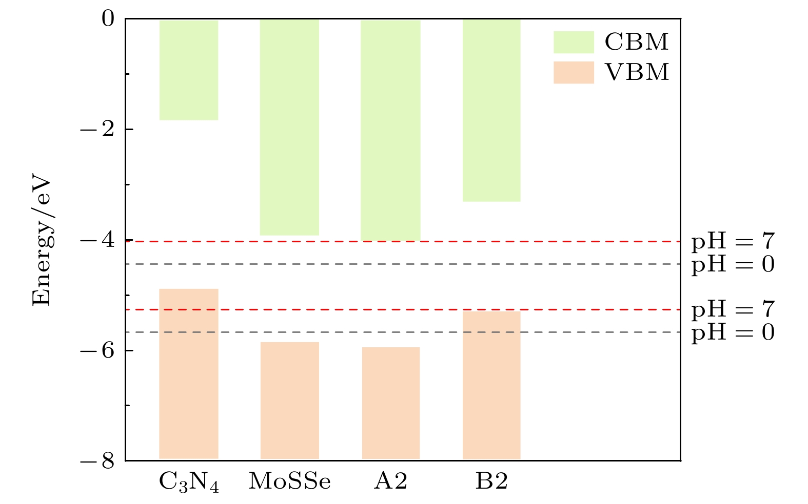 构建范德瓦耳斯异质结是丰富二维材料物性并增强其光电等性能的有效策略. 本文基于第一性原理模拟, 系统地研究了两种不同界面结构的Janus MoSSe/g-C3N4异质结(即SMoSe/g-C3N4和SeMoS/g-C3N4)的电子性质及其双轴应变调控规律. 结果表明, 针对SMoSe/g-C3N4异质结构, MoSSe本征偶极场与界面电场方向一致, 相互叠加形成由g-C3N4指向MoSSe的增强电场, 体系呈现I型能带排列特征; 而在SeMoS/g-C3N4异质结构中, 两者方向相反, 部分相互抵消后形成由MoSSe指向g-C3N4的净电场, 呈现II型能带排列特征, 可促进载流子的分离从而有效提升其光催化分解水活性. 进一步研究发现, 施加双轴应变可有效地调节两种异质结构的电子能带, 尤其在SeMoS/g-C3N4中可实现I型与II型能带结构的可逆转变. 本研究为Janus MoSSe/g-C3N4异质结在光催化与光电器件领域的应用提供了理论依据.Constructing van der Waals (vdW) heterostructures has emerged as an effective strategy for enriching the physical properties of two-dimensional materials and optimizing their optoelectronic performance. In this work, we systematically investigate the electronic properties and biaxial strain modulation of Janus MoSSe/g-C3N4 heterostructures with two distinct interfacial configurations—SMoSe/g-C3N4 and SeMoS/g-C3N4—by means of first-principles simulations. Binding energy comparisons and AIMD simulations are performed to determine the most stable stacking pattern of each type of the heterostructure. The analyses of the electrostatic potential and work function reveal that the intrinsic dipole of MoSSe layer and the interfacial electric field in the SMoSe/g-C3N4 heterostructure undergo a constructive superposition. This enhances the overall built-in electric field, which points from g-C3N4 layer to MoSSe layer, resulting in a type-I band alignment. In contrast, in the SeMoS/g-C3N4 configuration, the two fields oppose each other, leading to a net electric field directed from MoSSe to g-C3N4 layer. This leads to a type-II band alignment, which facilitates spatial carrier separation and significantly enhances photocatalytic water-splitting activity. Furthermore, this study also demonstrates that biaxial strain can effectively modulate the electronic band structures of both types of heterostructures. In particular, the SeMoS/g-C3N4 system exhibits a reversible transition between type-I and type-II band alignments under specific compressive (–4%) and tensile (+5%) strain states. The underlying mechanism is elucidated by the difference charge density calculations. This study provides theoretical insights into the role of interfacial and intrinsic dipoles combined with strain engineering, offering a viable route for designing efficient MoSSe/g-C3N4-based photocatalysts and optoelectronic devices.