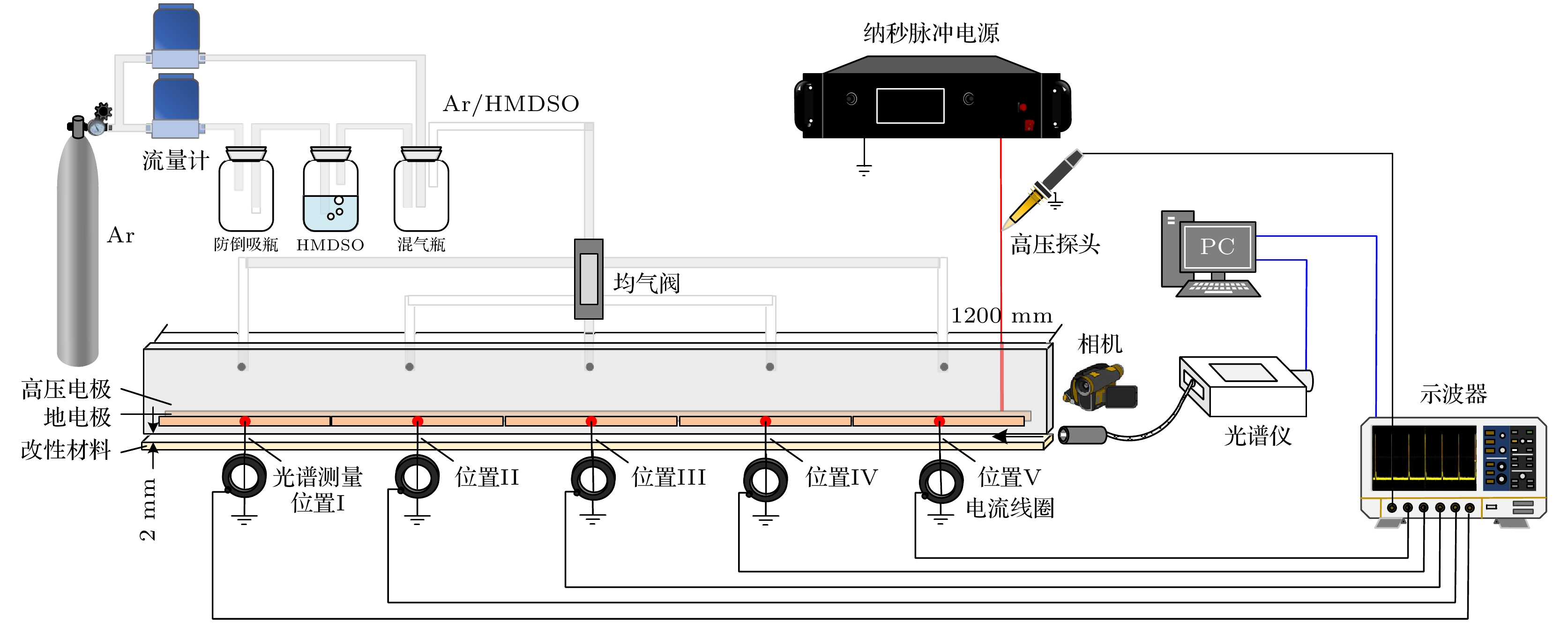 本文报道了一种新型米量级宽幅间接介质阻挡放电(DBD), 用于满足大尺度、形状复杂材料的处理需求. 通过模块化分级气路设计与仿真优化, 提高放电区域及被处理材料表面流场分布均匀性. 在此基础上, 以Ar作为工作气体, 以六甲基二硅烷(HMDSO)为反应媒质, 在纳秒脉冲电源激励下产生米量级宽幅等离子体. 通过电学、光谱、温度诊断方法来评估不同运行条件参数下的粒子活性、放电均匀性和稳定性, 并对环氧材料改性, 通过水接触角测量验证改性效果及其均匀性. 结果表明, 在合适的运行条件参数下, 可产生尺寸为1120 mm的宽幅均匀稳定等离子体. 增大电压幅值使放电强度和粒子活性提升, 但放电均匀性和稳定性会显著降低; 增大工作气体流速虽可同时提升粒子活性、放电均匀性和稳定性, 但提升幅度较小. 在电压幅值为12 kV、工作气体流速为10 L/min条件下处理10 min后, 环氧(EP)材料表面的水接触角从67°均匀提升至144°, 波动幅度低于6%. 本文所报道的米量级宽幅间接DBD电极可为大尺度等离子体材料改性技术工业应用提供参考和依据.A meter-scale wide indirect dielectric barrier discharge (DBD) for treating large-scale and irregular-shaped materials is reported in this study. The structure of the modular-graded gas path is designed, and the influence of gas hole density on the flow field is simulated. It is confirmed that 8 subdividing (40 holes uniformly distributed) structure can effectively improve the uniformity of the gas flow rate distribution in the discharge area and on the treated material surface compared with 0 subdividing structure. Based on this structure, Ar is employed as the discharge gas and hexamethyldisilane as the precursor to generate meter-scale wide plasma under the excitation of a nanosecond pulsed power supply. Particle activity, discharge uniformity and stability under different operating parameters are evaluated by measuring voltage-current waveforms, emission spectra, luminescence images and temperatures at different electrode positions. The treatment effect and uniformity are verified by measuring the water contact angle (WCA) of epoxy (EP) material. The results show that a uniform and stable plasma with a width of 1120 mm is generated under suitable operating parameters. By increasing the voltage amplitude, both the discharge intensity and particle activity are improved, while the discharge uniformity and stability are significantly reduced. By increasing the discharge gas flow rate, the particle activity, discharge uniformity, and stability can be improved simultaneously but slightly. The WCA on the EP surface is uniformly increased from 67° to 144° with a variation of less than 6% after 10-min treatment at a voltage amplitude of 12 kV and a discharge gas flow rate of 10 L/min. The meter-scale wide indirect DBD electrode in this work can provide reference and basis for the industrial application of large-scale plasma material modification technology.