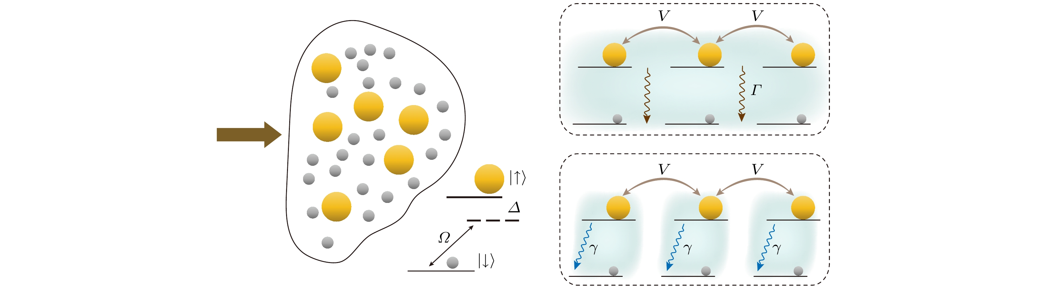 图 1 原子能级结构. 黄色和灰色的实心小球分别表示处在里德堡态和基态的原子. 外界存在稳定的激光来驱动系统远离平衡态. 激光与单个原子耦合的拉比频率为Ω, 失谐量为Δ. V表示处在里德堡态的原子之间的相互作用强度, Γ表示原子系统集体耗散速率, γ表示原子的独立耗散速率