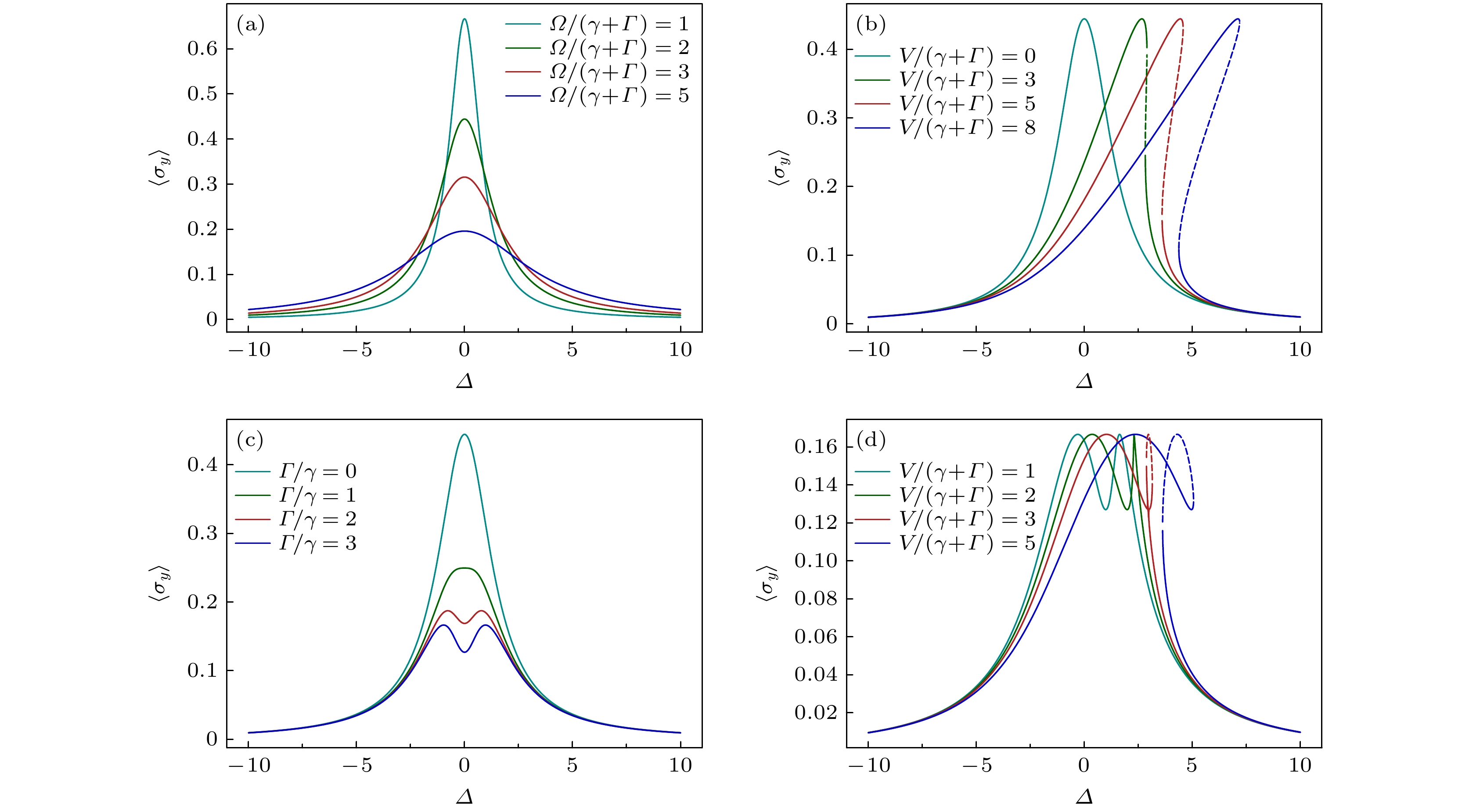 图 2 稳态时系统的吸收性质 (a) 不考虑相互作用和集体耗散时系统的吸收谱($ V=0 $, $ \Gamma=0 $), 呈现单原子时的单峰结构. (b) 原子相互作用对光谱的影响($ V\ne0 $, $ \Gamma=0 $). 相互作用引起谱线发生不对称弯曲. 当相互作用足够强时, 系统出现一般意义下的双稳态(图中虚线对应不稳定的解). (c) 考虑集体耗散时的吸收谱($ V=0 $, $ \Gamma\ne0 $). 随着系统集体耗散速率的增加, 原子光谱逐渐展宽且出现对称的双峰结构. (d) 相互作用和集体耗散同时存在时的原子光谱(固定$ \Gamma/\gamma=3 $). 相互作用使双峰结构变得不对称. (b—d)图中对应的$ \Omega/(\gamma+\Gamma)=2 $. 这里的参数设置均以$ \gamma+\Gamma $为量纲, 下同