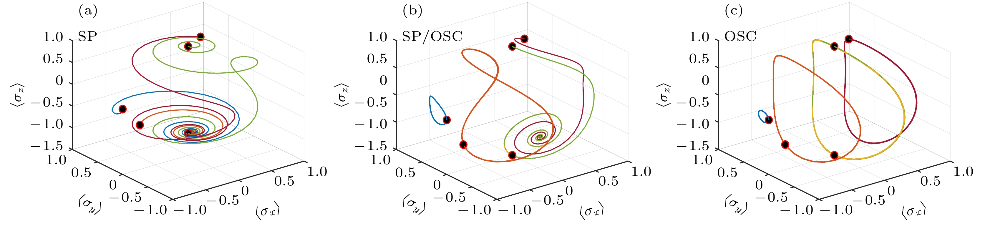 图 4 三种不同相区间下, 系统的动力学轨迹 (a) SP相: $ \Omega=0.2\Gamma $, 不同初始态都会到达一个不随时间变化的稳态. (b) SP/OSC相: $ \Omega=1.5\Gamma $, 一部分初始态会形成周期性振荡, 而一部分初始态会到达稳态上. (c) OSC相: $ \Omega=4\Gamma $, 任意初始态均会形成周期性的振荡. 这里固定$ V=3\Gamma $