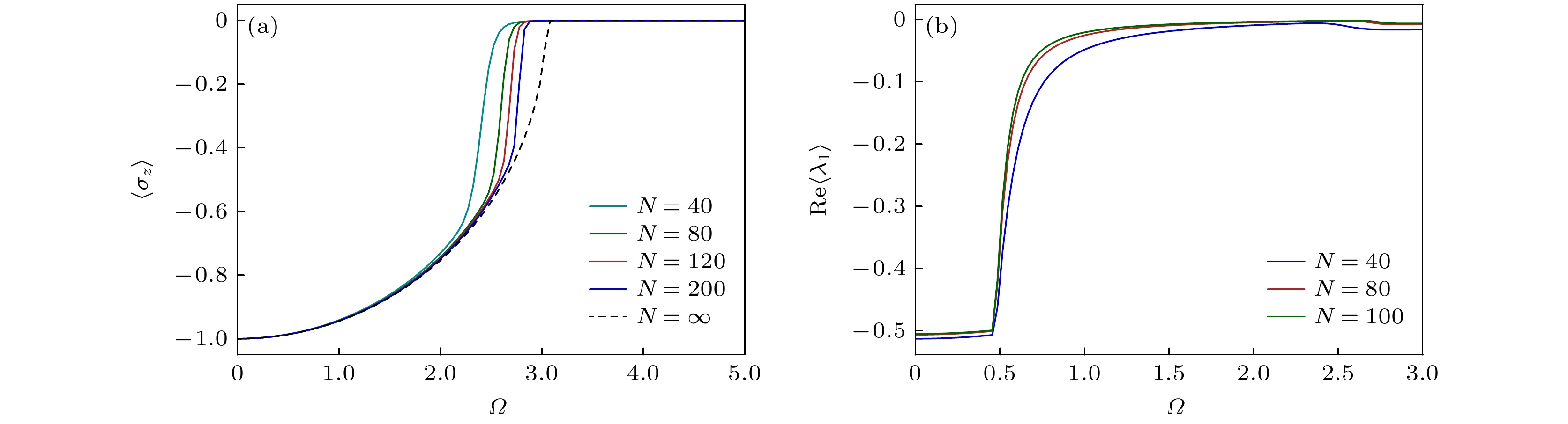 Fig. 5. (a) Steady-state expectation value $ \langle\sigma_z\rangle $ for a finite-dimensional quantum system, obtained via the Liouvillian spectral method. The dashed line shows the mean-field approximation result. (b) Real part of the slowest mode eigenvalue $ {\rm{Re}}(\lambda_{1}) $ of the Liouvillian spectrum as a function of Ω. Both panels are for $ V=3\Gamma $.