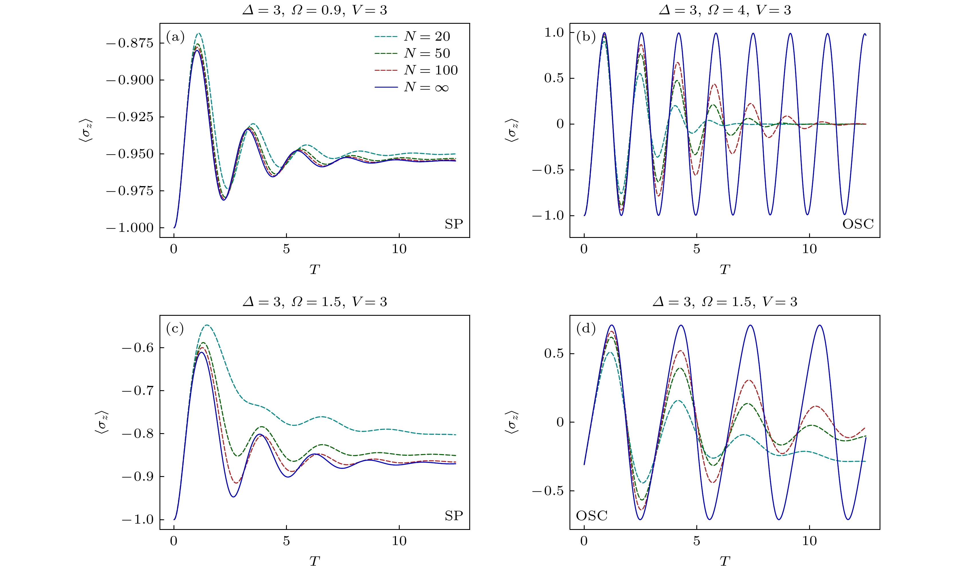 图 6 不同相对应的参数下, 有限维的量子系统与平均场近似下的动力学演化 (a)和(b)分别表示处在在SP和OSC参数下系统的动力学演化. (c)和(d)是在相同的参数(SP/OSC)下, 不同的初始态对应的动力学演化