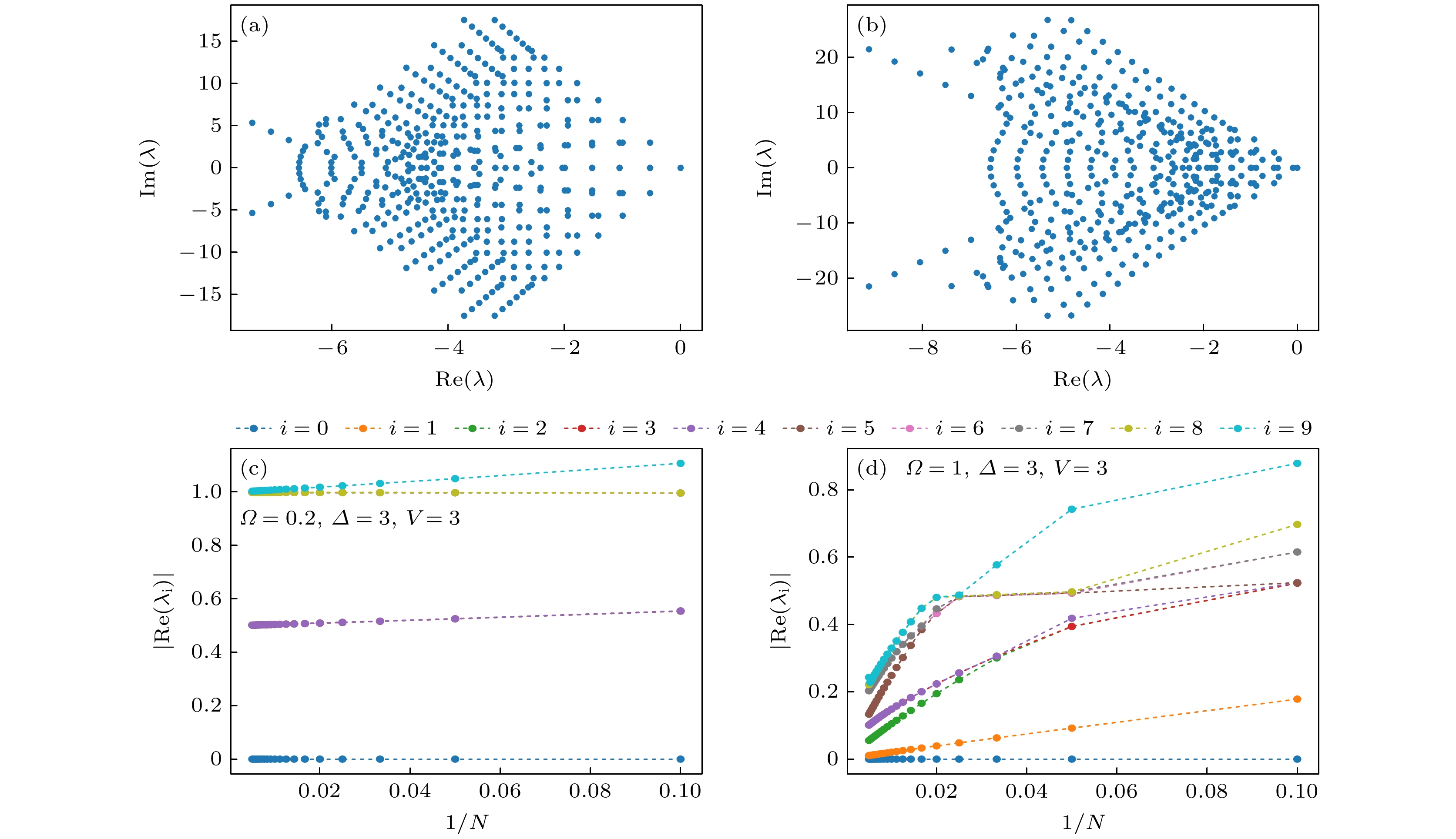 图 7 刘维尔能谱结构图 (a)和(b)分别对应$ \Omega=0.2\Gamma $(SP相), $ 1\Gamma $(SP/OSC相)的刘维尔能谱($ N=20 $). (c)和(d)为相应的能谱$ \lambda_{i}(i=0, \cdots9) $实部绝对值随粒子数的变化, 这里以$ \left | Re(\lambda_{i}) \right | $升序排列. 可见在SP相(a, c), 能谱并不会随着系统维度而收敛至零, 而在OSC相(b, d)存在的参数区间, 能谱随N的增大而逐渐收敛至零, 即热力学极限下的能隙闭合