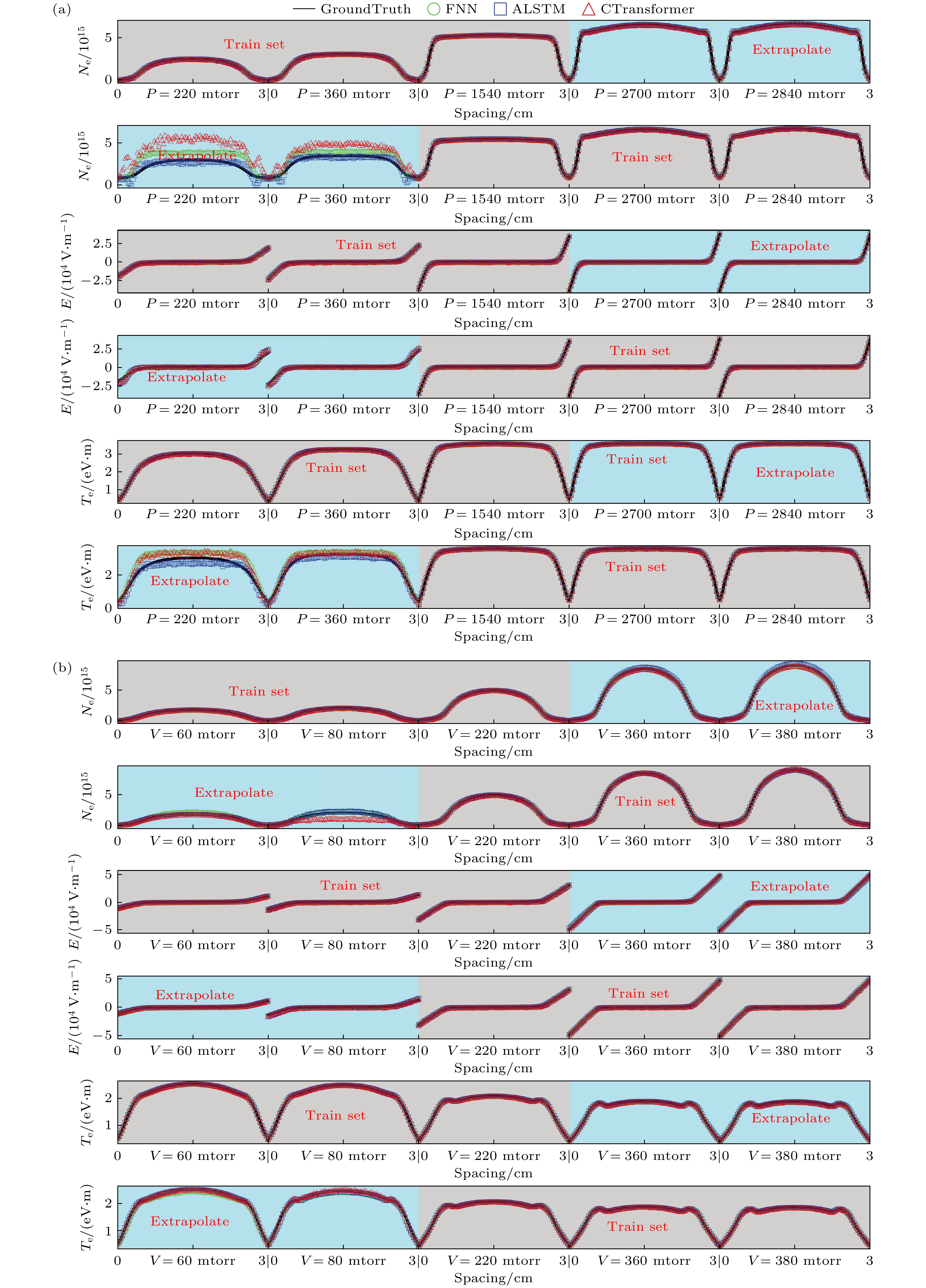 Fig. 5. Extrapolation performance of FNN, ALSTM, and CTransformer for time-averaged spatial profiles of electron density, electric field, electron temperature on (a) the pressure set and (b) the voltage set(Electrode spacing is 0–3 cm). The blue-shaded area represents the extrapolation set, while the gray-shaded area is the training set.