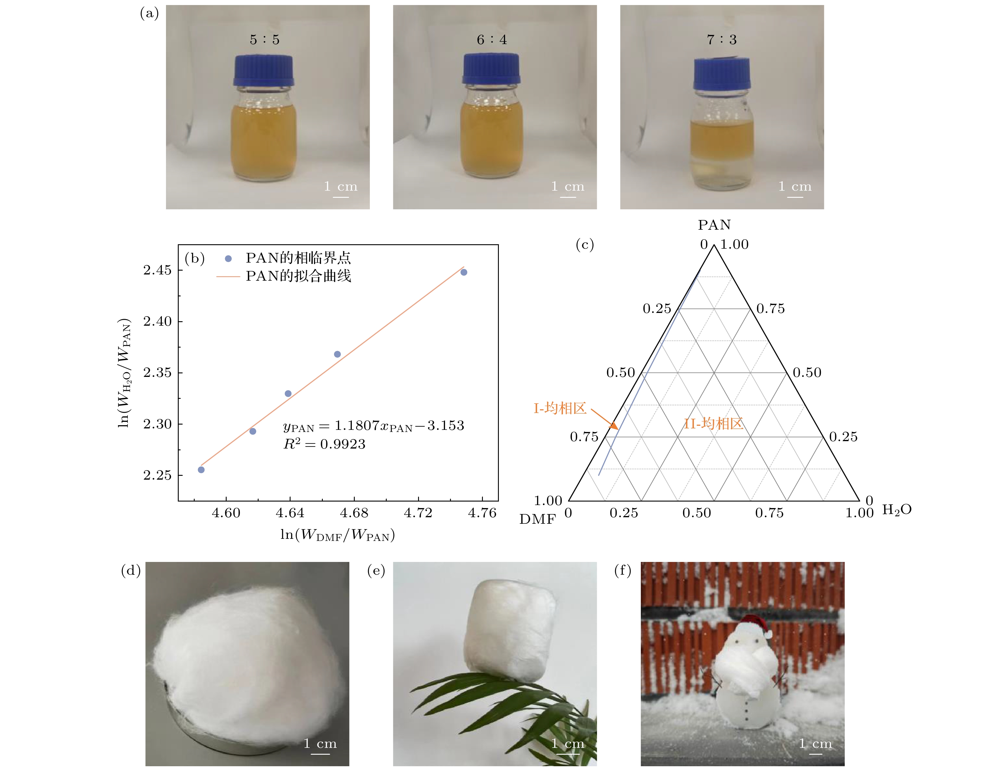 图 1 蓬松结构相变纤维的制备原理和展示照片 (a) PEG/PAN纺丝液组成为5∶5, 6∶4, 7∶3时的相稳定性展示; (b) PAN-H2O-DMF的浊点曲线; (c) PAN-H2O-DMF体系的三元相图; (d) PEG/PAN相变纤维的展示照片; (e) 超轻的PEG/PAN相变纤维立于树叶表面; (f) 在寒冷环境下PEG/PAN相变纤维穿戴于雪人的冷防护演示照片