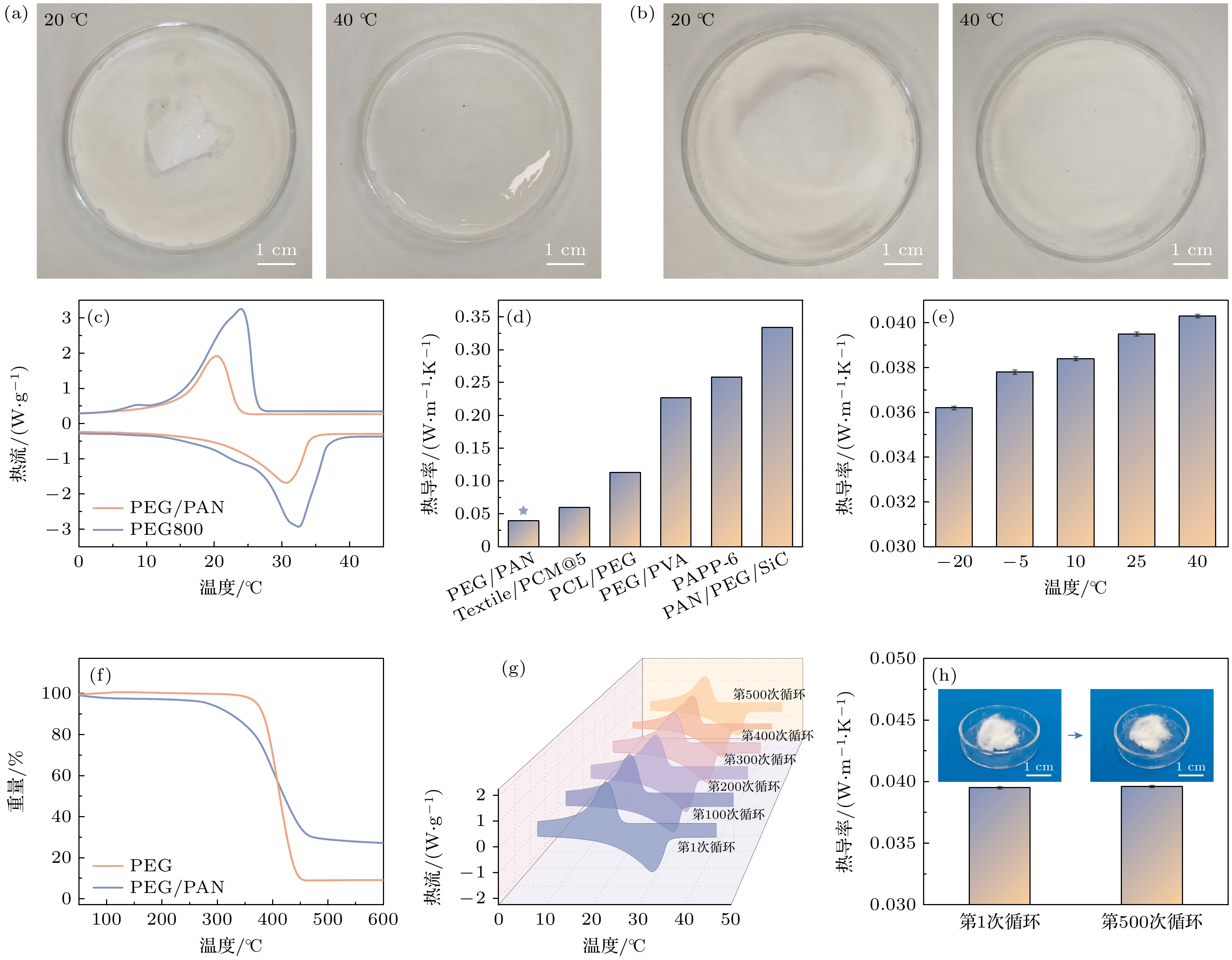 图 4 PEG/PAN相变纤维的相变性能和热性能 (a) 纯PEG和(b) PEG/PAN相变纤维在20 ℃和40 ℃的宏观形貌数码照片; (c) 纯PEG和PEG/PAN相变纤维的DSC曲线; (d) 本研究PEG/PAN相变纤维与文献中报道的用于冷防护相变织物在热导率性能的对比[3,31–34]; (e) PEG/PAN纤维在–20—40 ℃的热导率变化图; (f) 纯PEG和PEG/PAN相变纤维的TG曲线; (g) PEG/PAN相变纤维经历1—500次热循环的DSC曲线; (h) PEG/PAN相变纤维经历热循环前后的导热率