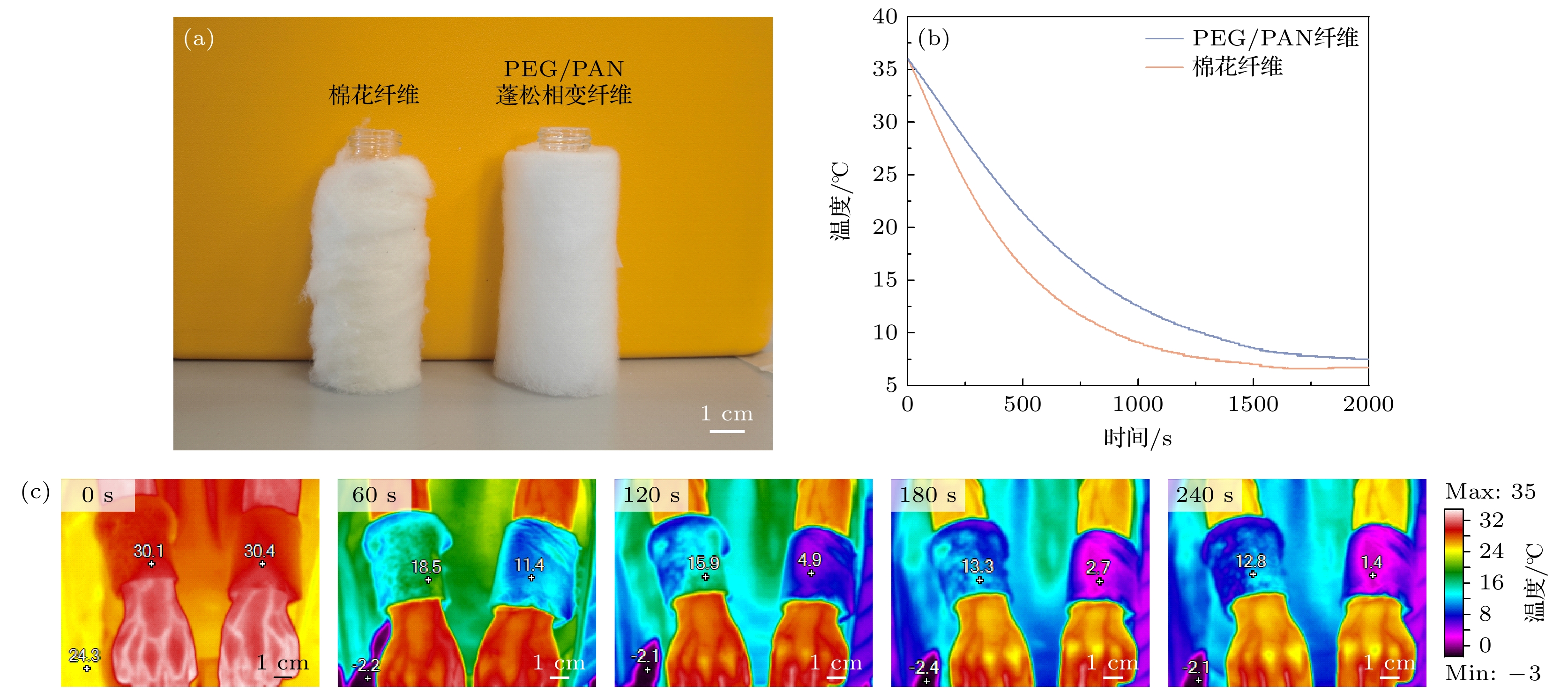 图 6 PEG/PAN相变纤维的人体冷防护实验 (a) 冷防护实验展示图; (b) 温度-时间变化曲线; (c) 棉花和PEG/PAN相变纤维应用与人体的热红外成像图