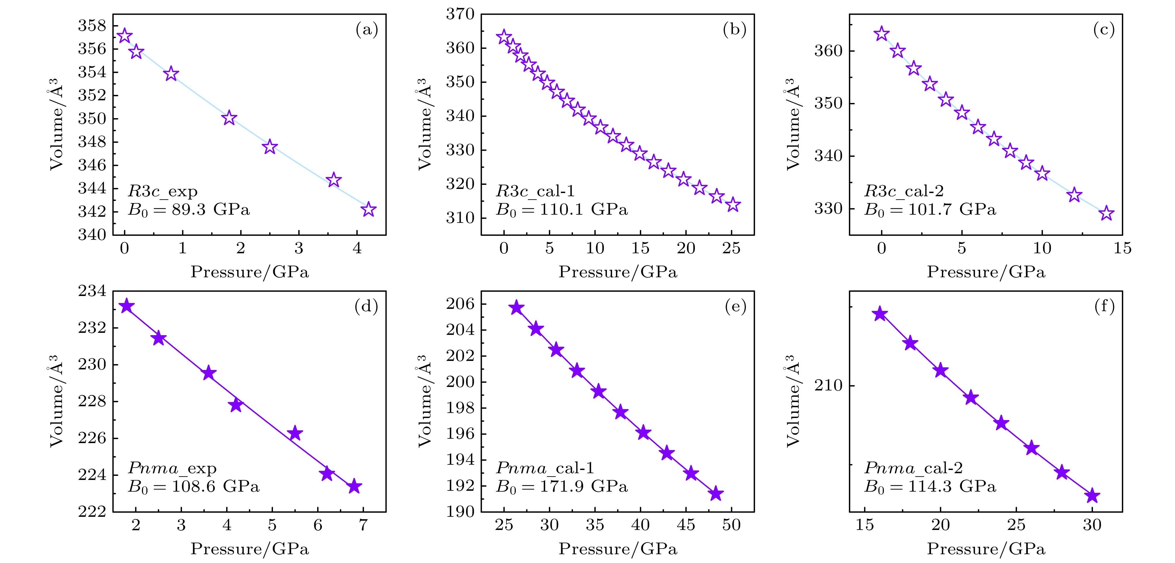 图 4 NBT体积压力曲线拟合结果 (a)—(c) 中子衍射实验、Cal-1和Cal-2计算获得的R3c相体积压力曲线; (d)—(f) 中子衍射实验、Cal-1和Cal-2计算获得的Pnma相体积压力曲线