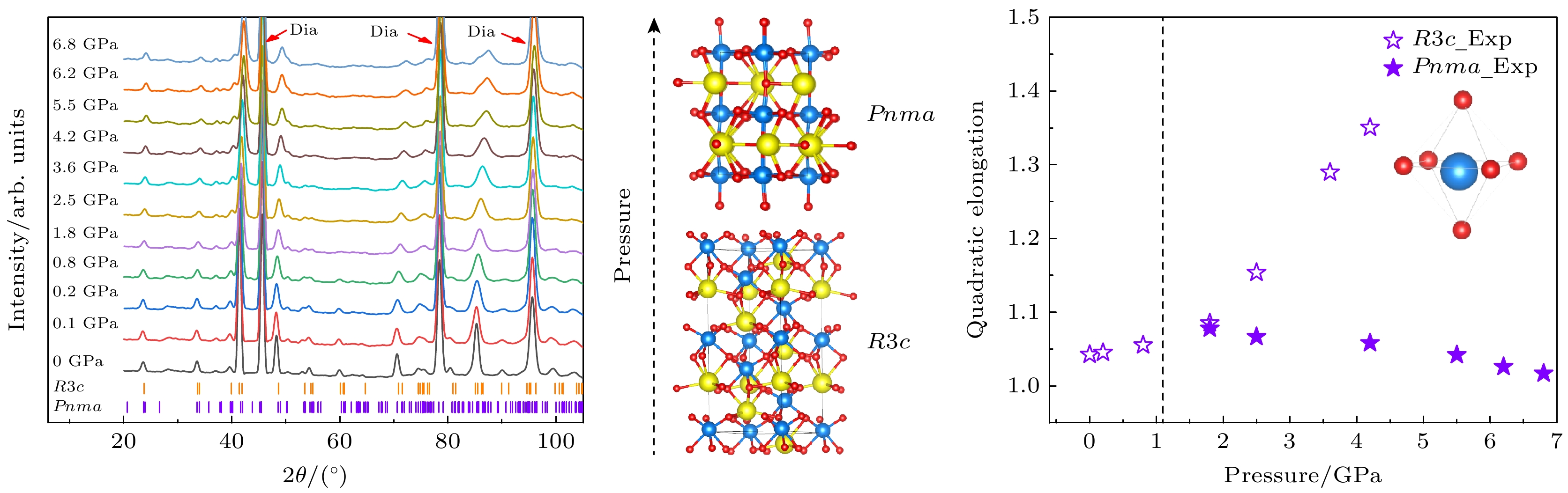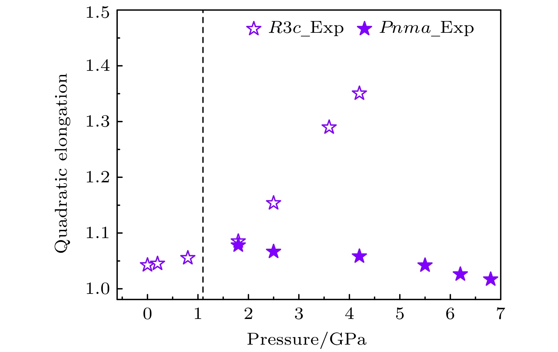 P/GPa Rhombohedral-R3c (Z = 6) Orthorhobmic-Pnma (Z = 4) Rwp/% a/Å c/Å a/Å b/Å c/Å 0 5.51769 13.53806 — — — 4.96 0.1 5.51658 13.52609 — — — 4.30 0.2 5.51054 13.51019 — — — 4.35 0.8 5.49948 13.52777 Phase appears 4.78 1.8 5.48487 13.43632 5.48603 5.48620 7.74757 6.39 2.5 5.47163 13.40546 5.47582 5.46863 7.72857 6.39 3.6 5.45653 13.36911 5.46078 5.45307 7.70844 4.95 4.2 5.44308 13.33665 5.44823 5.43878 7.6879 6.04 5.5 Phase disappears 5.43504 5.42606 7.67246 6.26 6.2 — — 5.41434 5.41443 7.64334 5.75 6.8 — — 5.41406 5.40337 7.63613 6.52 -