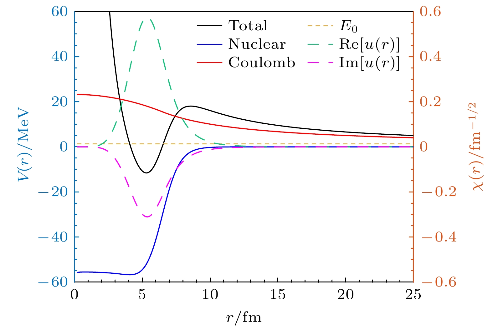 Fig. 1.  The daughter-proton interaction potential in 151Lu in the spherical case and the Gamow state wave function of the emitted proton. The solid lines denotes different parts of potential, while the real part (green dashed line) and the imaginary part (purple dashed line) of the wave function are corresponding to the right axis with the real part of the energy as the yellow dotted horizontal line.