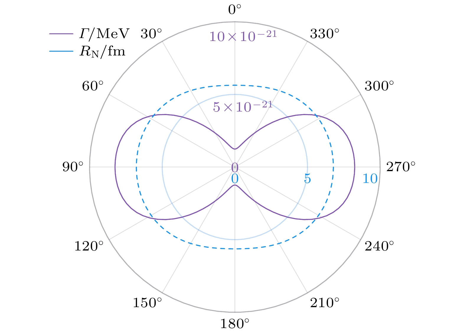 图 2  151Lu核中子核Woods-Saxon半径的形变(虚线) 与母核质子放射性衰变宽度的角分布(实线)
