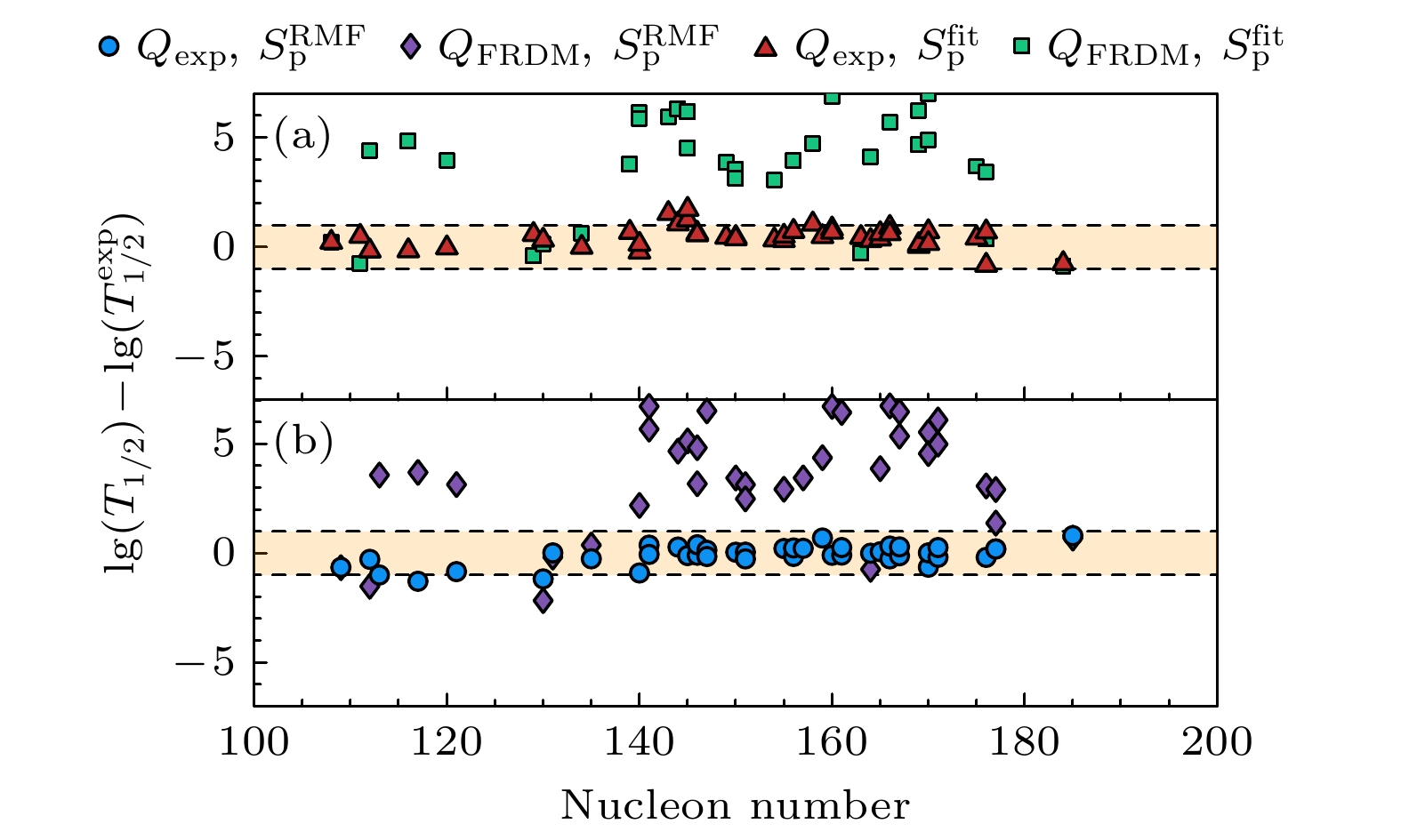 图 3  本文的理论模型在实验衰变能和FRDM衰变能参数下对半衰期的计算误差 (a) 使用拟合得到的谱因子; (b) 使用RMF理论得到的谱因子. 阴影部分代表对数下的计算值与实验值相差在1以内