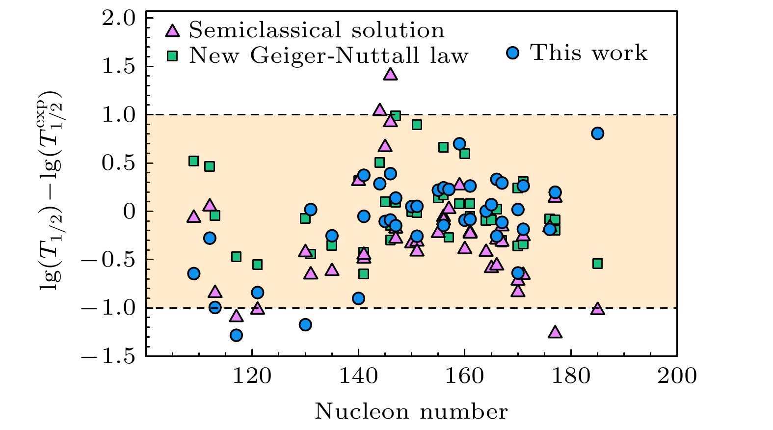 Fig. 4.  The difference between this work and other theoretical methods (including an analytic semiclassical solution[11] and the new Geiger-Nuttall law[44]). The horizontal axis denotes the nucleon number of the parent nucleus, while the vertical axis illustrates the difference between the logarithms of the calculated and experimental half-lives.