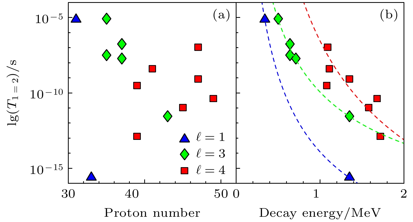 图 5  本文理论预言的质子数30到50的一系列质子放射核的半衰期, 及其与(a)母核质子数和(b)实验衰变能之间的关系, 其中与衰变能的关系符合Geiger-Nuttal定律, 如图中虚线所示