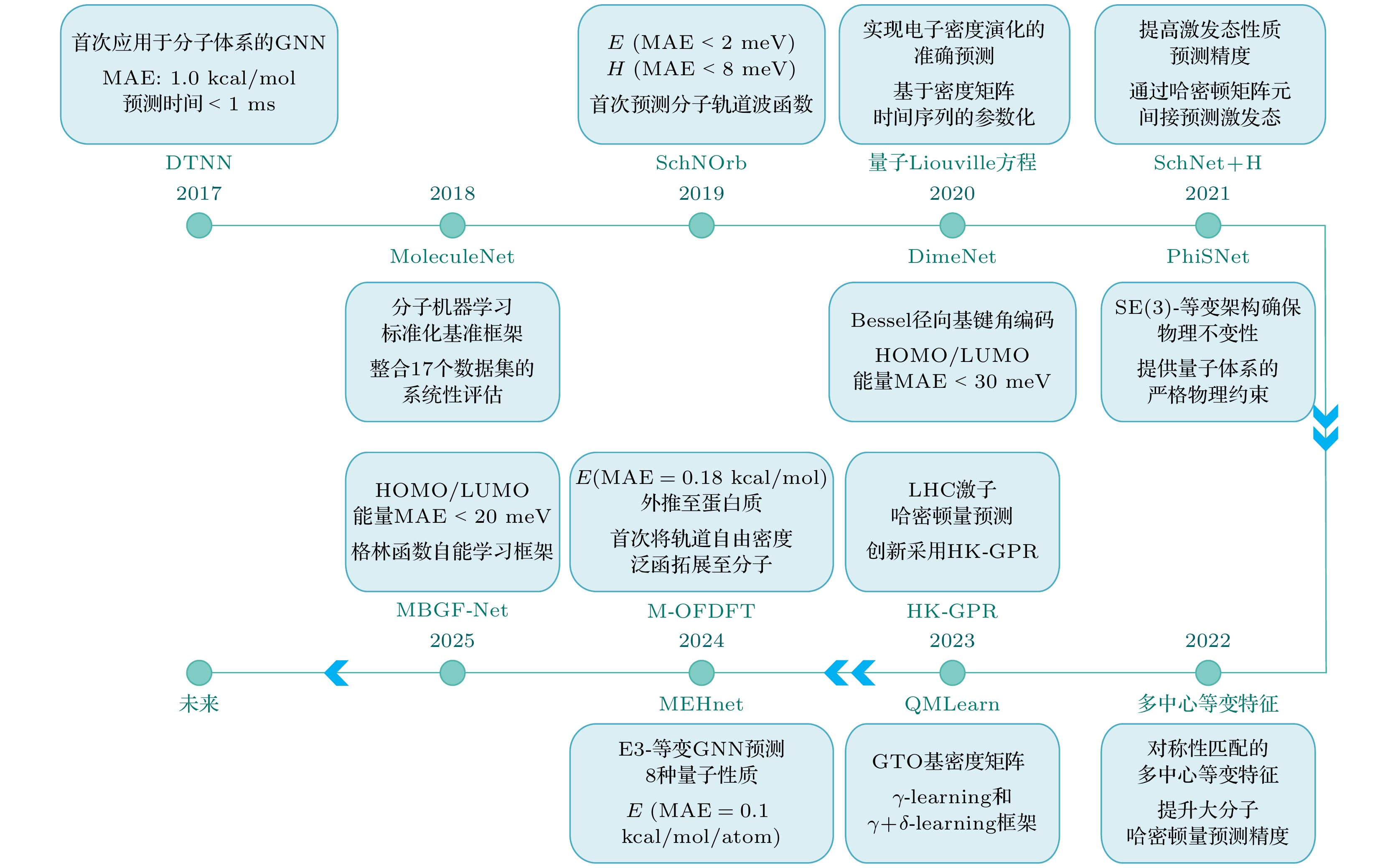 • 图 1  ML加速电子结构计算模型在分子领域发展时间轴(2017—2025), 来源于Hegde和Bowen[22] (2017)、Schütt等[11,28] (2017, 2019)、Gasteiger等[29] (2020)等文献[2641]并整理. 图中E为轨道能量, H为哈密顿矩阵, MAE为平均绝对误差, GNN为图神经网络, DTNNs为深度张量神经网络, GPR为高斯过程回归, HOMO/LUMO为最高占据分子轨道/最低未占据分子轨道, LHC为光捕获复合物, KRR为核岭回归, GTO 为高斯轨道