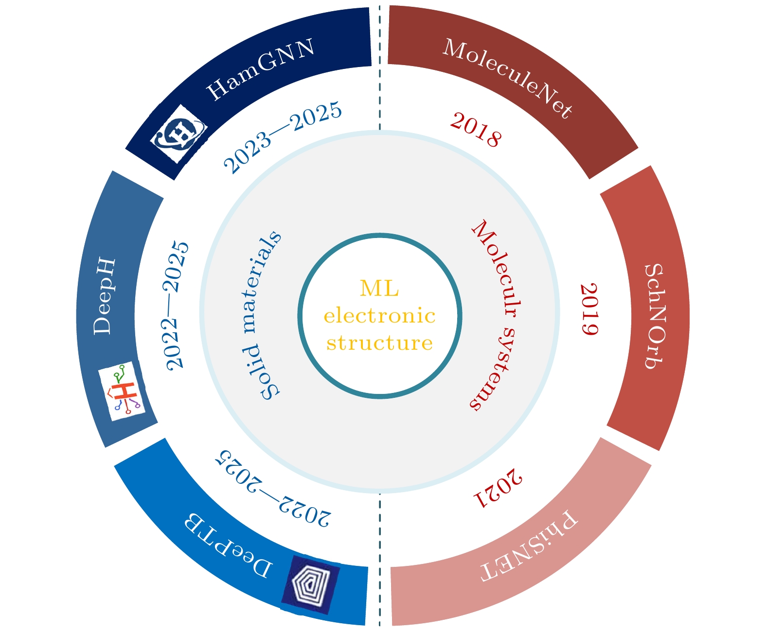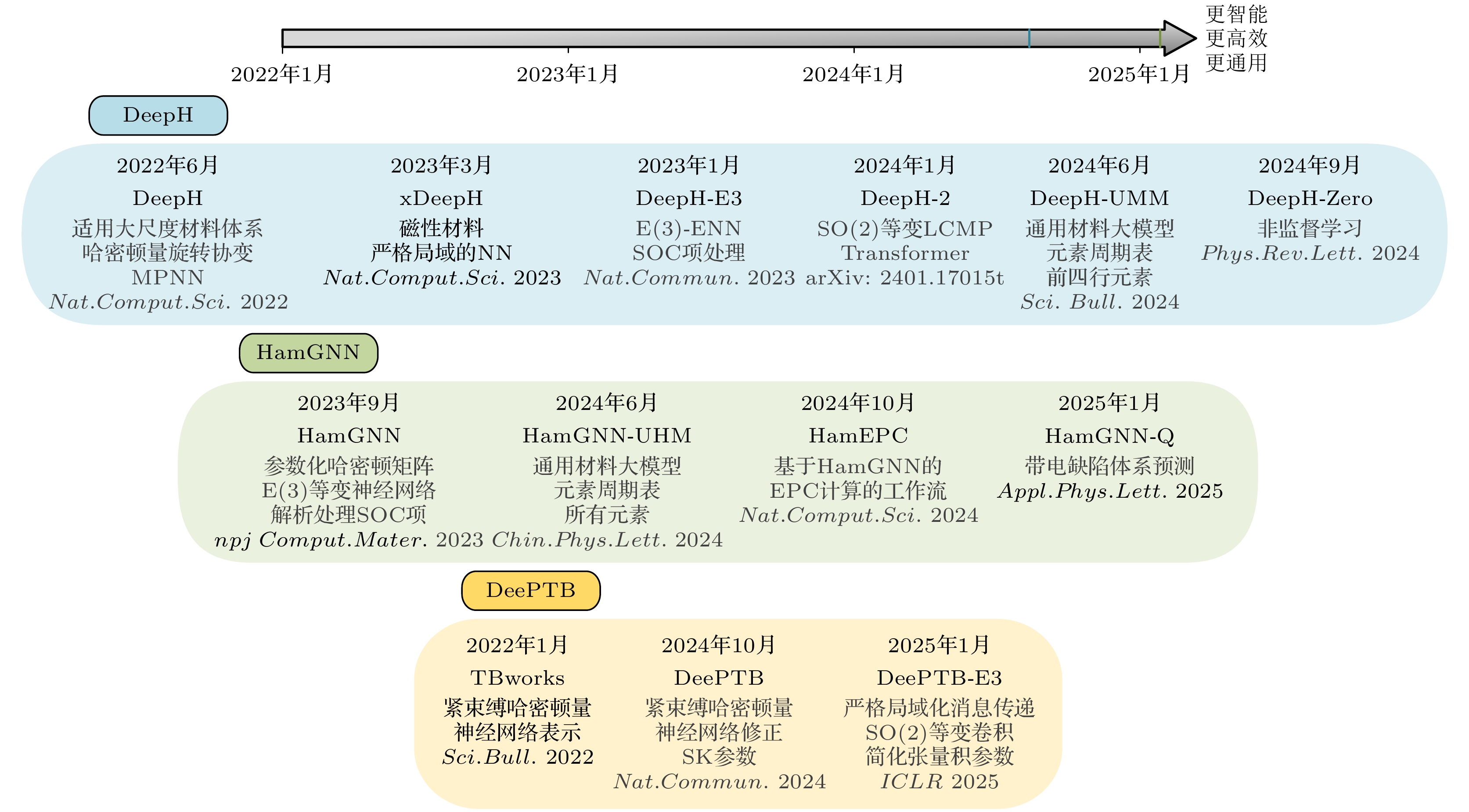Fig. 2.  Timeline (2022—2025) of machine-learning-accelerated electronic-structure models in solid systems, compiled from the works of Xu Yong (2022—2025), Xiang Hongjun (2023—2025), Gu Qiangqiang (2024, 2025) and Refs. [4556].