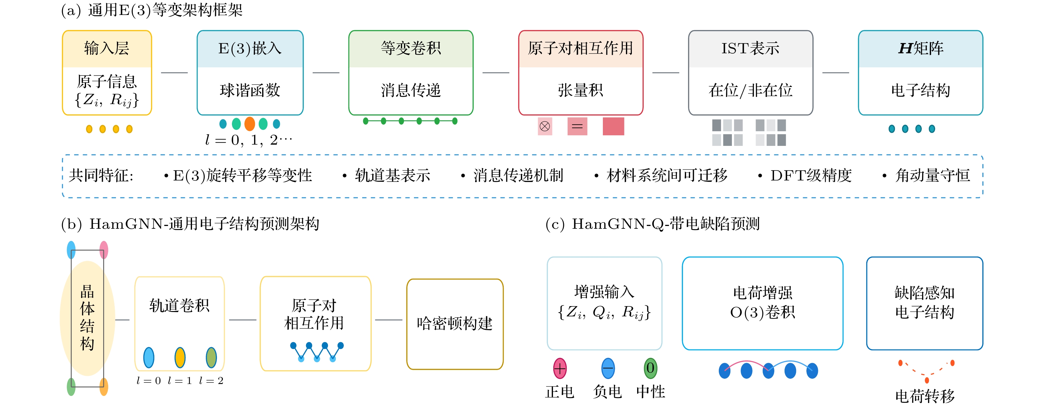 Fig. 4.  Architecture evolution of deep electronic structure prediction models of HamGNN: (a) Common E(3)-equivariant framework of HamGNN and HanGNN-Q[51]; (b) general electronic structure prediction architecture of HamGNN[51]; (c) charged defect prediction specialist of HamGNN-Q[54].