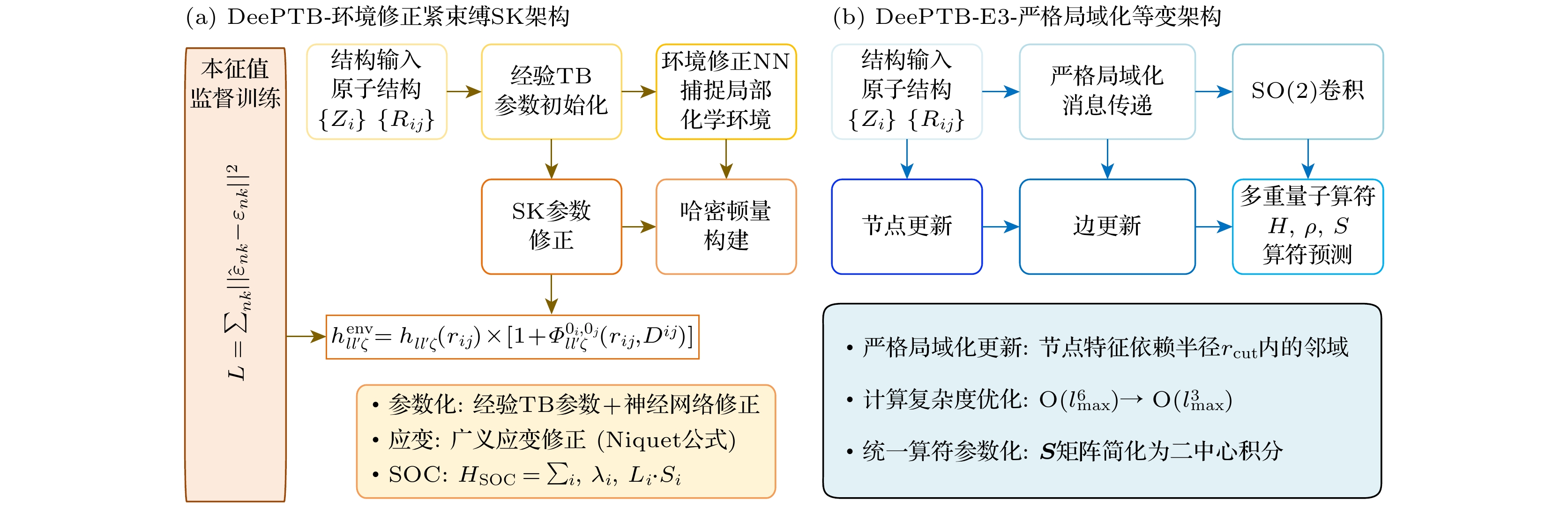 Fig. 5.  Architecture of the DeePTB and DeePTB-E3 method: (a) General architecture of DeePTB[55]; (b) the strictly localized equivariant message-passing architecture of DeePTB-E3[56].