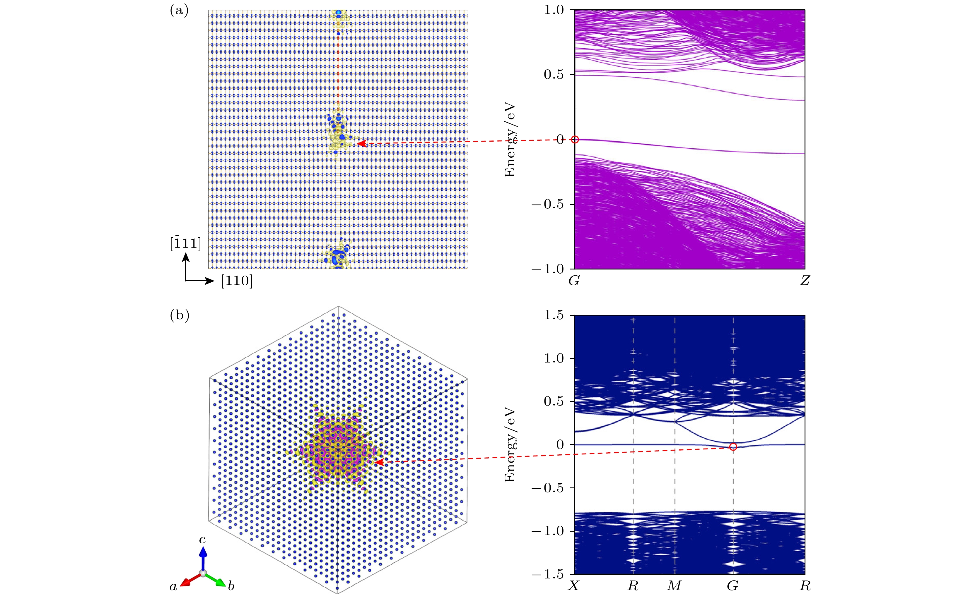 Fig. 7.  Examples of defect system predictions using machine learning-accelerated electronic structure methods: (a) Band structure and charge density of a silicon dislocation predicted by using the HamGNN model[51]; (b) band structure and charge density of a charged defect structure in gallium arsenide (GaAs) by using the HamGNN-Q model[54].