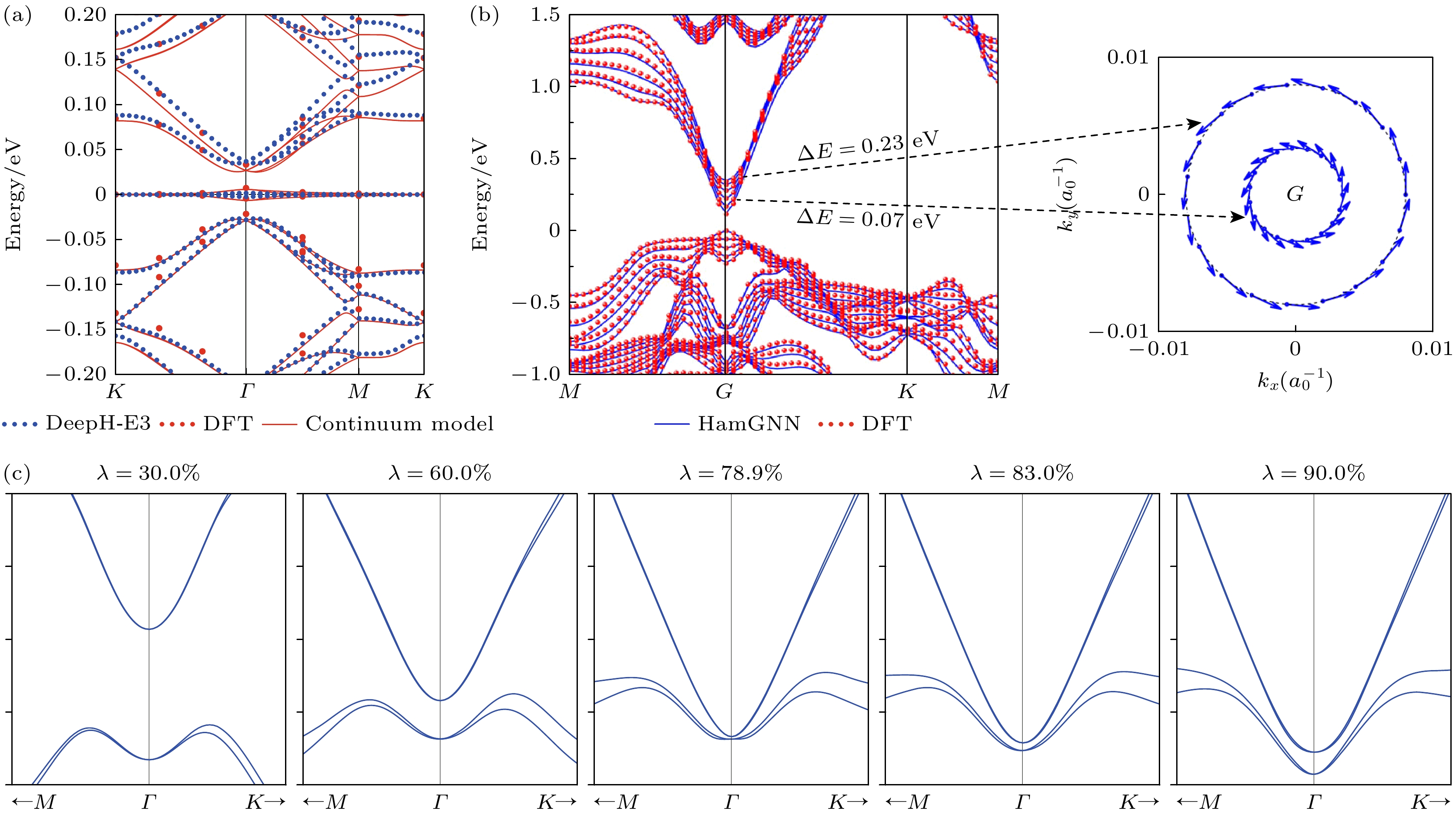 Fig. 8.  Several examples of machine-learning-accelerated electronic-structure calculations applied to quantum materials: (a) Comparison of the band structure predicted by using the DeepH-E3 model with the DFT-computed band structure for a twisted bilayer graphene supercell containing 11164 atoms at a twist angle of 1.08°[47]; (b) band structure of Bi2Se3 thin film with the HamGNN model compared to DFT results, together with the spin–momentum locking of the unoccupied states near the conduction-band minimum[51]; (c) DeepH-E3 of a topological quantum phase transition driven by varying SOC strength: after gap closure, the gap re-opens, changing the 2 invariant from 0 to 1[47].