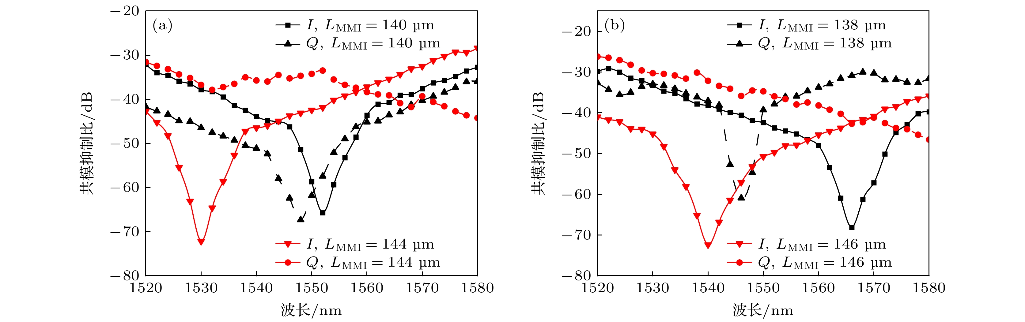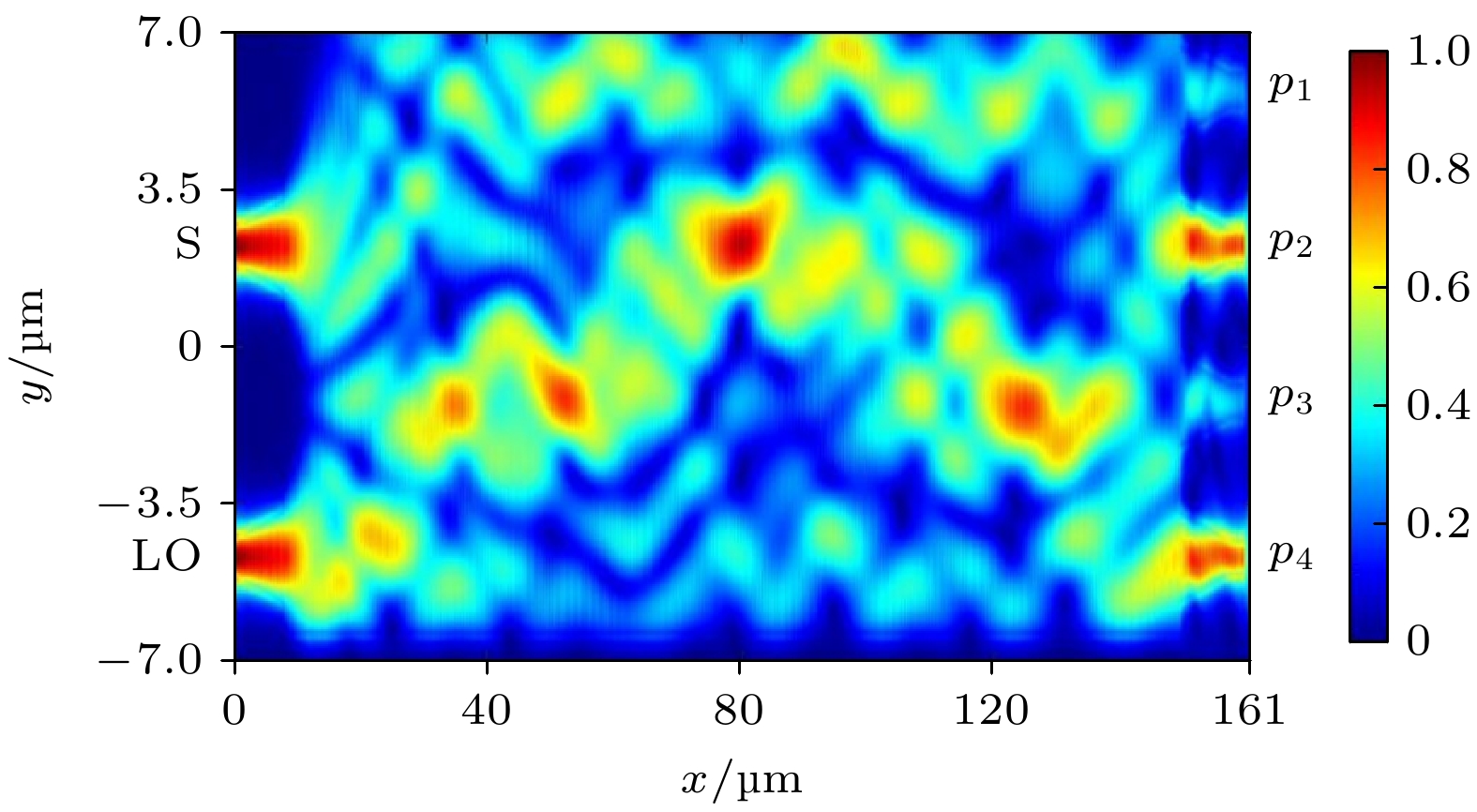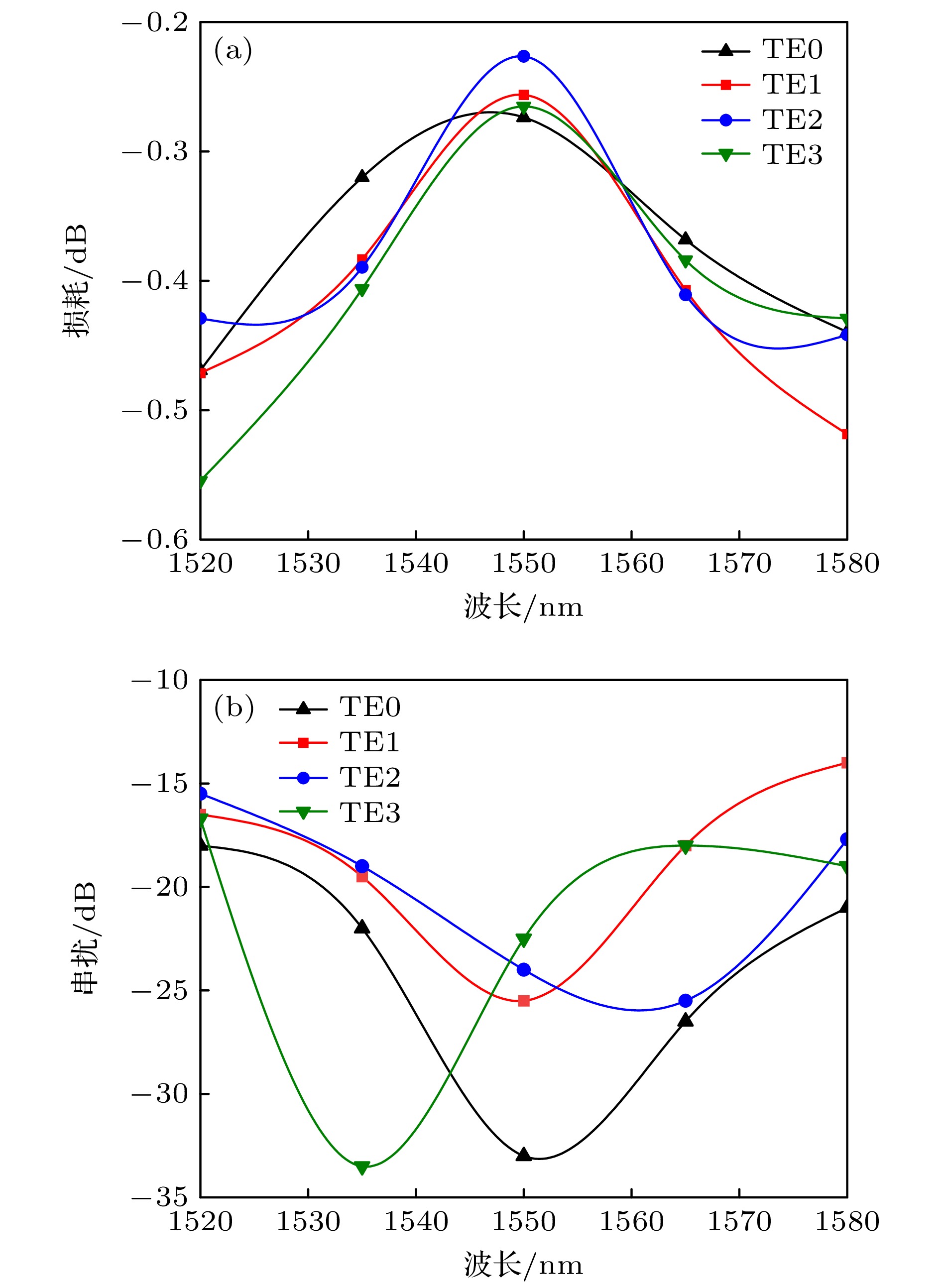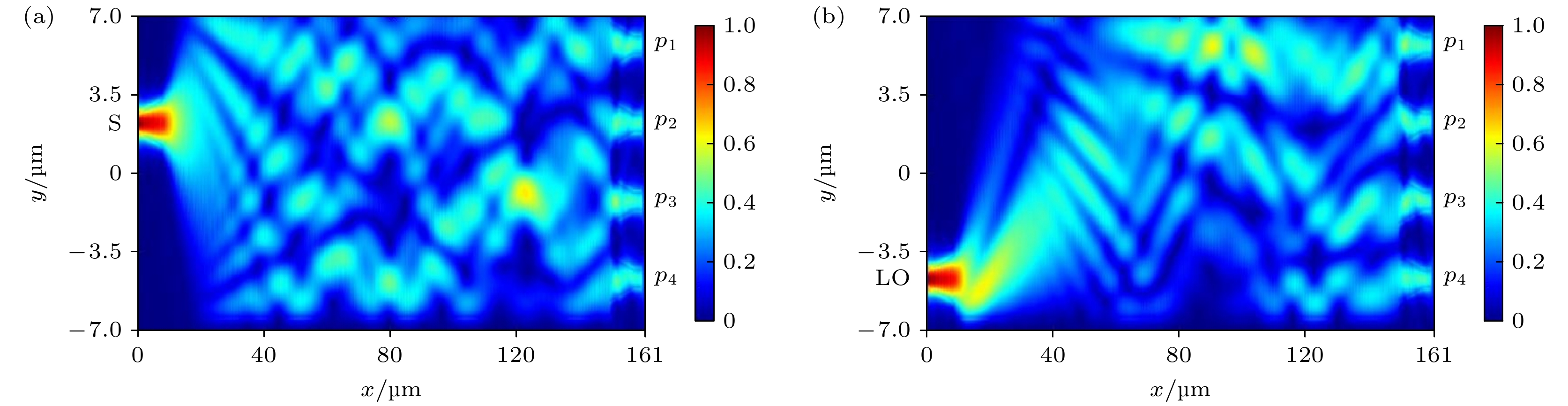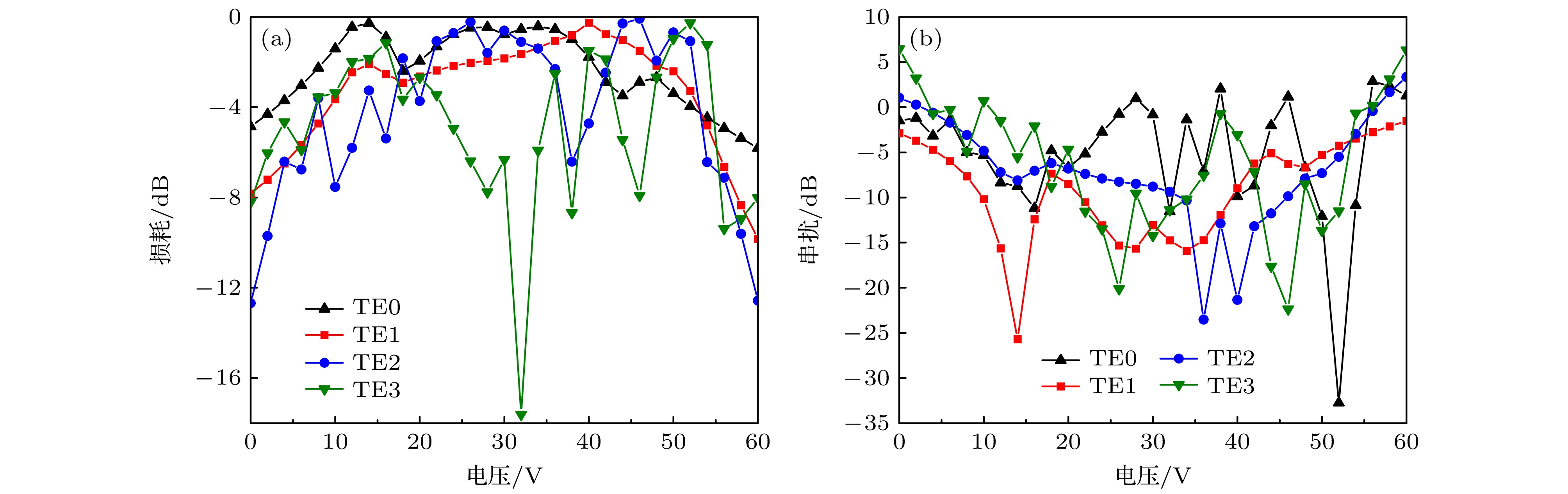 90°光混频器是无线相干光通信系统接收端的关键器件, 在提升接收端灵敏度和抗干扰能力方面发挥着重要作用. 传统的90°光混频器存在对精度要求高、体积大、受限于模式失配、偏振敏感和功能单一等缺点. 为解决上述问题且进一步实现器件的多功能化, 在铌酸锂平台基于多模干涉(multimode Interference, MMI)结构, 设计了兼具90°光混频和模式分离功能的多功能集成器件. 该器件在功能上具备良好的可扩展性, 在性能上均优于传统结构, 具有低损耗、高精度和宽带宽的特点, 并通过容差分析验证了器件在较大工艺误差范围内仍能保持优异的性能, 展现了较高的工艺容差性和可靠性. 该器件可同时应用于大规模集成光学中, 为高性能片上光通信系统提供了新技术.90°optical mixer, as an essential part of coherent optical communication and heterodyne detection, improves polarization discrimination and anti-interference capabilities, increases receiver sensitivity, and permits demodulation of higher-order modulation forms. The disadvantages of traditional 90° optical mixers, however, include their high precision needs, size, mode mismatch restrictions, polarization sensitivity, and single functionality. Utilizing a lithium niobate platform, a multimode interference (MMI) structure, and a micro-thermoelectric electrode array, and with the help of the finite difference time domain (FDTD) method, a multipurpose device that combines 90° optical mixing and mode separation capabilities is designed in this work. According to the results, when no voltage is applied across the micro-thermoelectric electrodes, the multipurpose device acts as a 90° optical mixer. The common-mode rejection ratios of all four outputs are all above –30 dB, phase errors are below 4°, and the losses in the wavelength range of 1520–1580 nm exceed –13.862 dB. When a voltage is applied across the micro-thermoelectric electrodes, TE0, TE1, TE2, and TE3 modes are separated by the multipurpose device acting as a mode splitter. In addition to controlling crosstalk fluctuation within 8.8 dB, the minimum loss divergence between modes is less than 0.024 dB. Research findings indicate that the physical characteristics of optical field interference within the MMI structure enable perfect phase matching and energy distribution across a wide spectrum range, even when no voltage is supplied across the micro-thermoelectric electrode terminals. By controlling the interference superposition process inside the multi-mode region and improving broadband 90° optical mixing parameters, the stable phase-matching conditions are maintained across the wide spectrum. The lithium niobate-based linear electro-optic effect (Pockels effect) modifies the waveguide refractive index distribution through an external electric field when a voltage is applied across the micro-thermoelectrodes. By changing the light field’s coupling path and propagation mode inside the MMI structure, the mode-separating integrator can precisely achieve mode separation, thereby confirming the efficiency of the electro-optic effect in optical functional control, which meets the isolation requirements for various mode optical signals. Furthermore, a systematical tolerance analysis of the device’s width and length is carried out, demonstrating how structural dimensional deviations affect the mode coupling efficiency and optical field interference circumstances. The integrated broadband 90° optical mixer and mode splitter device described in this paper has excellent process tolerance properties.