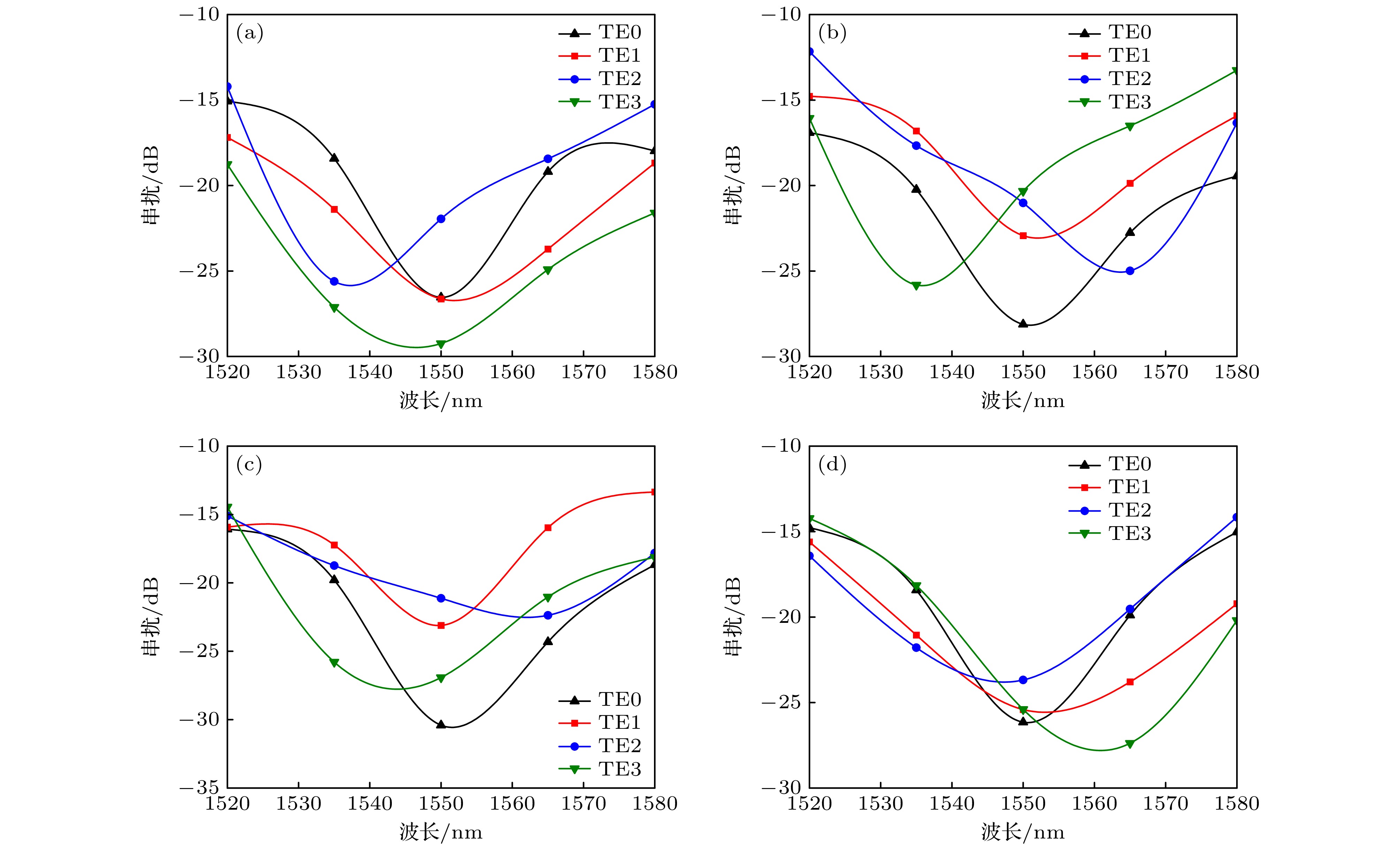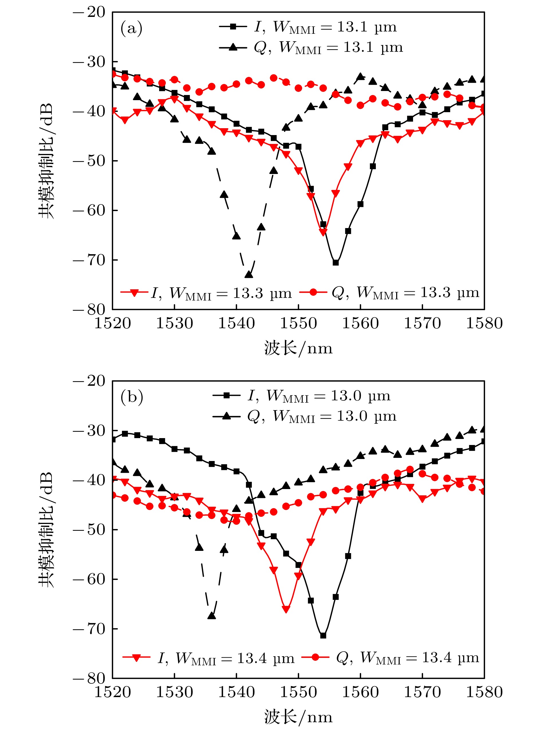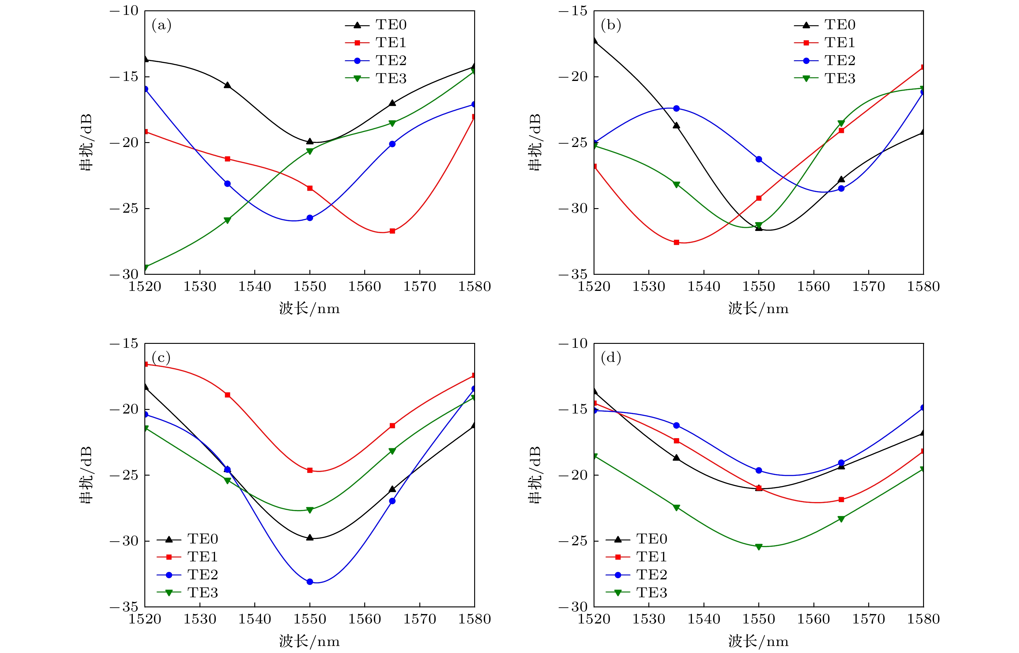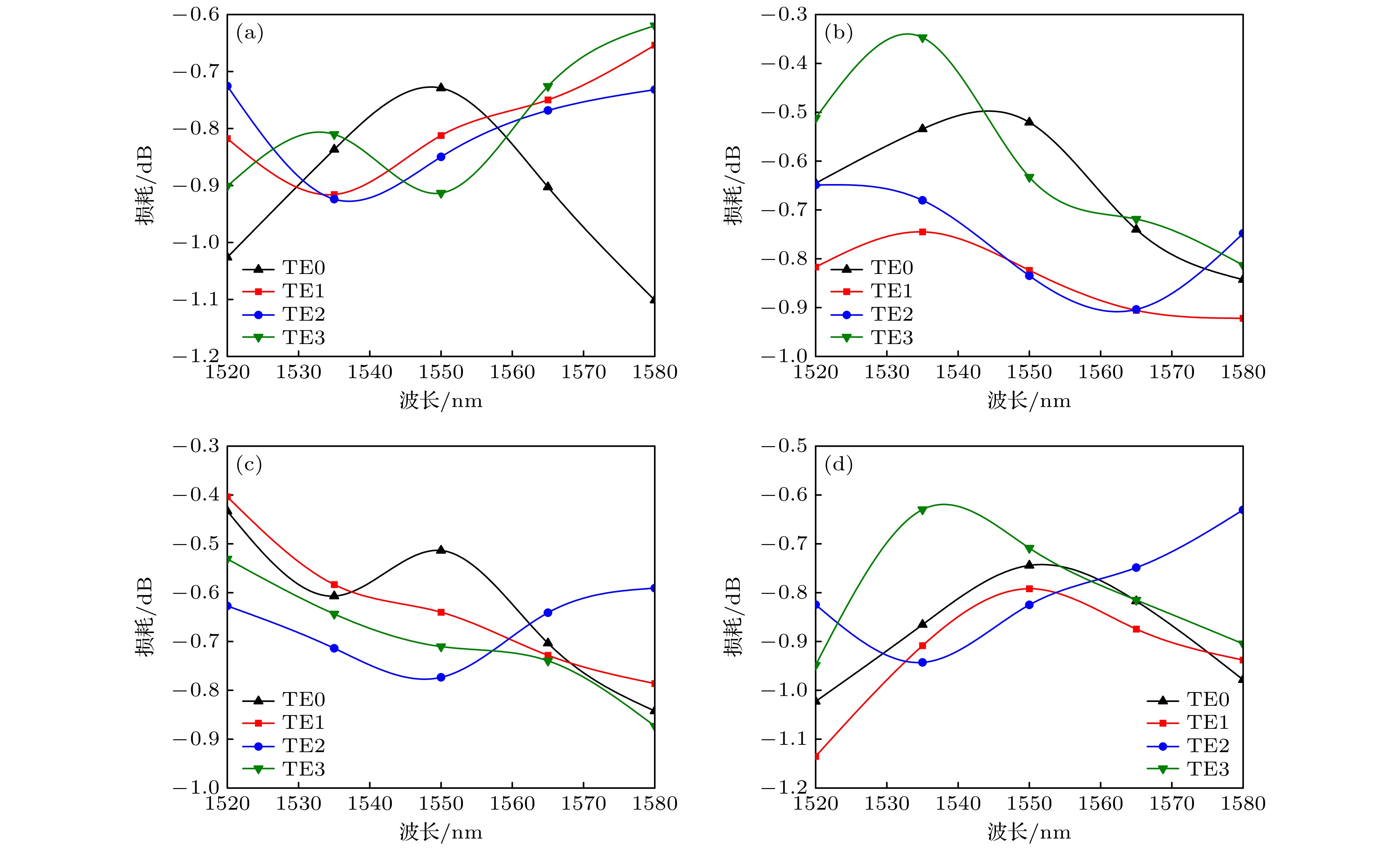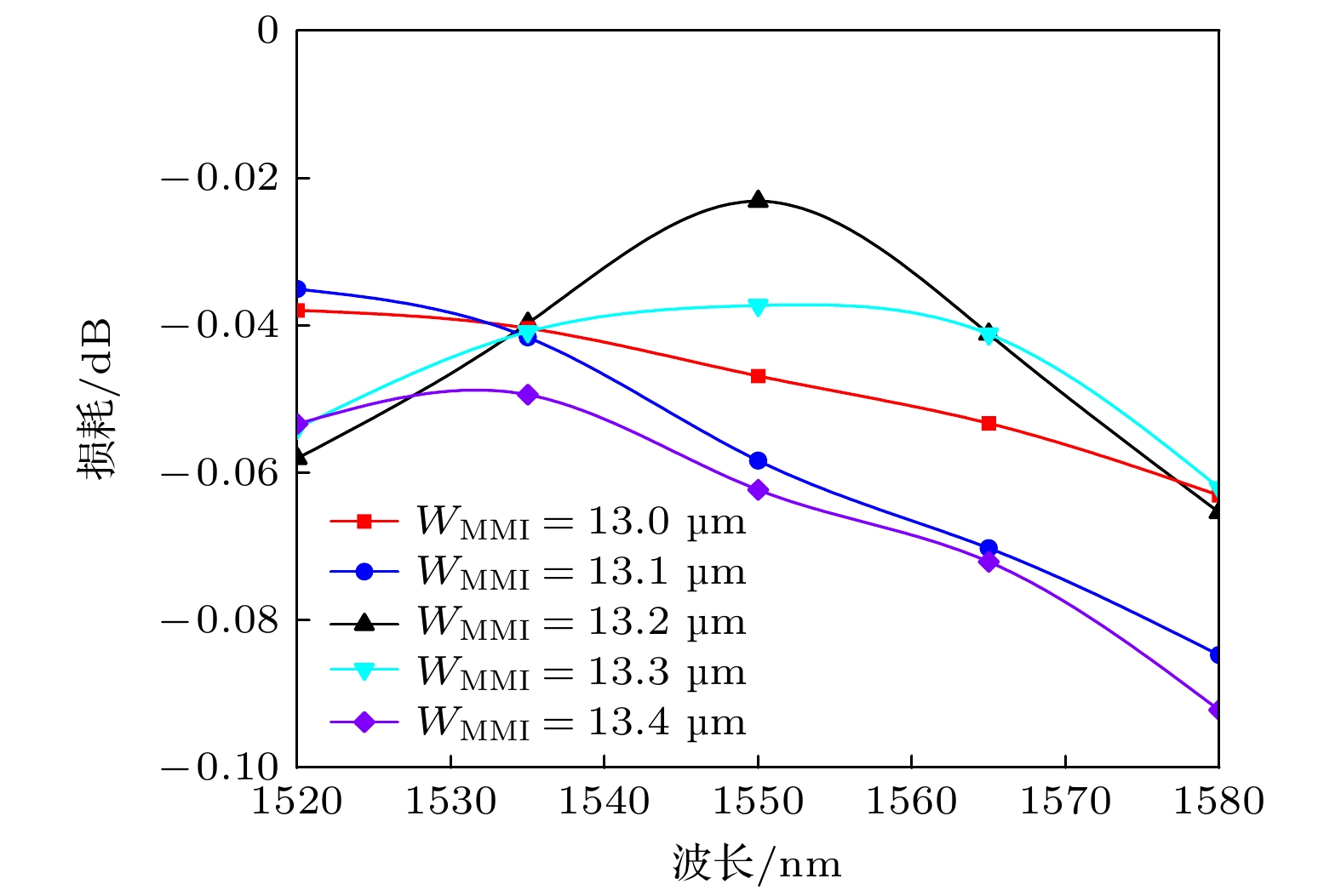 90°光混频器是无线相干光通信系统接收端的关键器件, 在提升接收端灵敏度和抗干扰能力方面发挥着重要作用. 传统的90°光混频器存在对精度要求高、体积大、受限于模式失配、偏振敏感和功能单一等缺点. 为解决上述问题且进一步实现器件的多功能化, 在铌酸锂平台基于多模干涉(multimode Interference, MMI)结构, 设计了兼具90°光混频和模式分离功能的多功能集成器件. 该器件在功能上具备良好的可扩展性, 在性能上均优于传统结构, 具有低损耗、高精度和宽带宽的特点, 并通过容差分析验证了器件在较大工艺误差范围内仍能保持优异的性能, 展现了较高的工艺容差性和可靠性. 该器件可同时应用于大规模集成光学中, 为高性能片上光通信系统提供了新技术.90°optical mixer, as an essential part of coherent optical communication and heterodyne detection, improves polarization discrimination and anti-interference capabilities, increases receiver sensitivity, and permits demodulation of higher-order modulation forms. The disadvantages of traditional 90° optical mixers, however, include their high precision needs, size, mode mismatch restrictions, polarization sensitivity, and single functionality. Utilizing a lithium niobate platform, a multimode interference (MMI) structure, and a micro-thermoelectric electrode array, and with the help of the finite difference time domain (FDTD) method, a multipurpose device that combines 90° optical mixing and mode separation capabilities is designed in this work. According to the results, when no voltage is applied across the micro-thermoelectric electrodes, the multipurpose device acts as a 90° optical mixer. The common-mode rejection ratios of all four outputs are all above –30 dB, phase errors are below 4°, and the losses in the wavelength range of 1520–1580 nm exceed –13.862 dB. When a voltage is applied across the micro-thermoelectric electrodes, TE0, TE1, TE2, and TE3 modes are separated by the multipurpose device acting as a mode splitter. In addition to controlling crosstalk fluctuation within 8.8 dB, the minimum loss divergence between modes is less than 0.024 dB. Research findings indicate that the physical characteristics of optical field interference within the MMI structure enable perfect phase matching and energy distribution across a wide spectrum range, even when no voltage is supplied across the micro-thermoelectric electrode terminals. By controlling the interference superposition process inside the multi-mode region and improving broadband 90° optical mixing parameters, the stable phase-matching conditions are maintained across the wide spectrum. The lithium niobate-based linear electro-optic effect (Pockels effect) modifies the waveguide refractive index distribution through an external electric field when a voltage is applied across the micro-thermoelectrodes. By changing the light field’s coupling path and propagation mode inside the MMI structure, the mode-separating integrator can precisely achieve mode separation, thereby confirming the efficiency of the electro-optic effect in optical functional control, which meets the isolation requirements for various mode optical signals. Furthermore, a systematical tolerance analysis of the device’s width and length is carried out, demonstrating how structural dimensional deviations affect the mode coupling efficiency and optical field interference circumstances. The integrated broadband 90° optical mixer and mode splitter device described in this paper has excellent process tolerance properties.