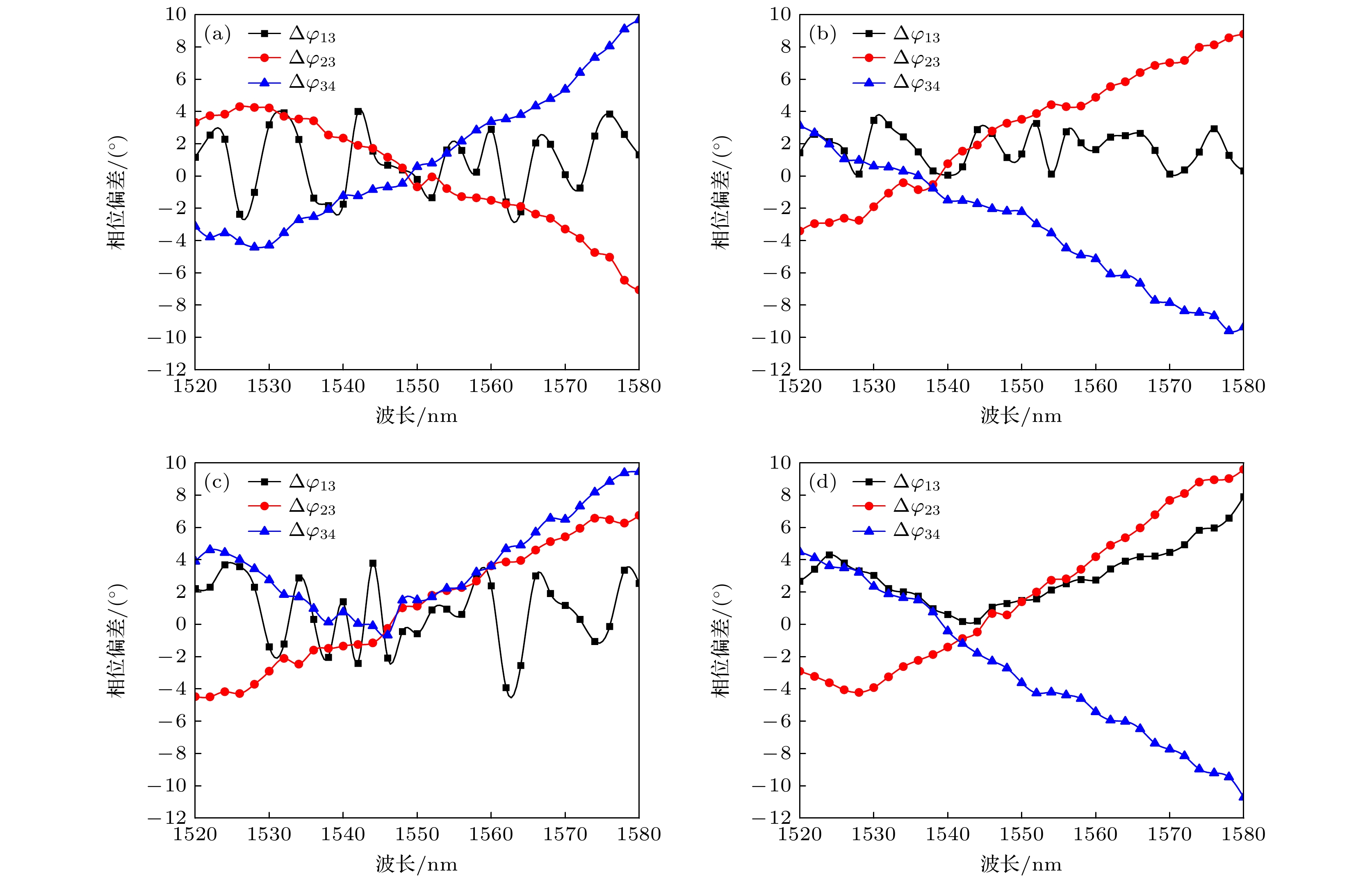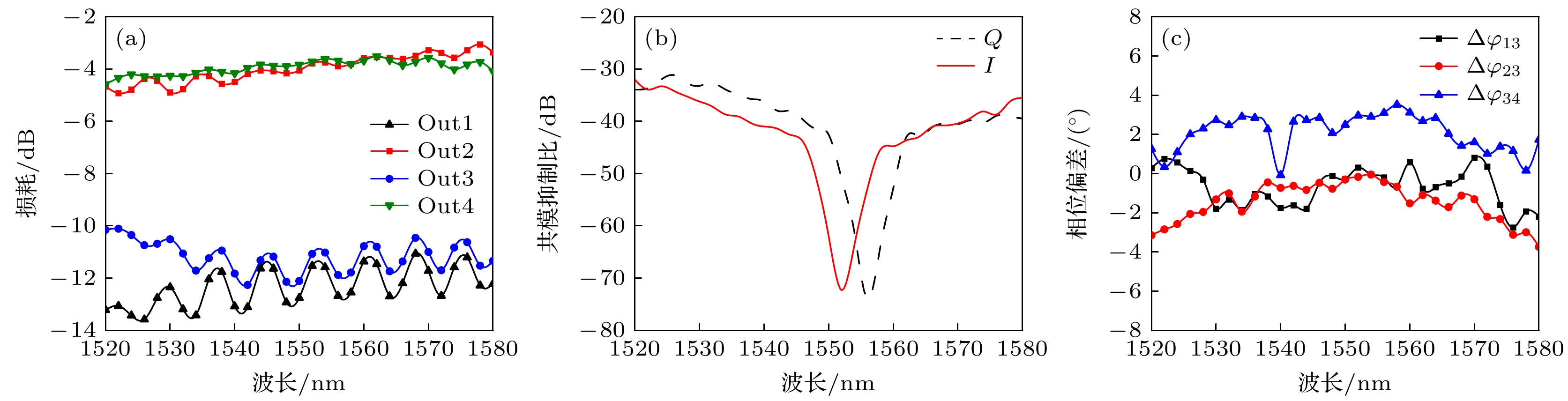 图 8 性能指标随波长变化情况 (a) 90°光混频器损耗随波长变化曲线; (b) 90°光混频器共模抑制比随波长变化曲线; (c) 不同输出端口之间的相位偏差随波长变化曲线