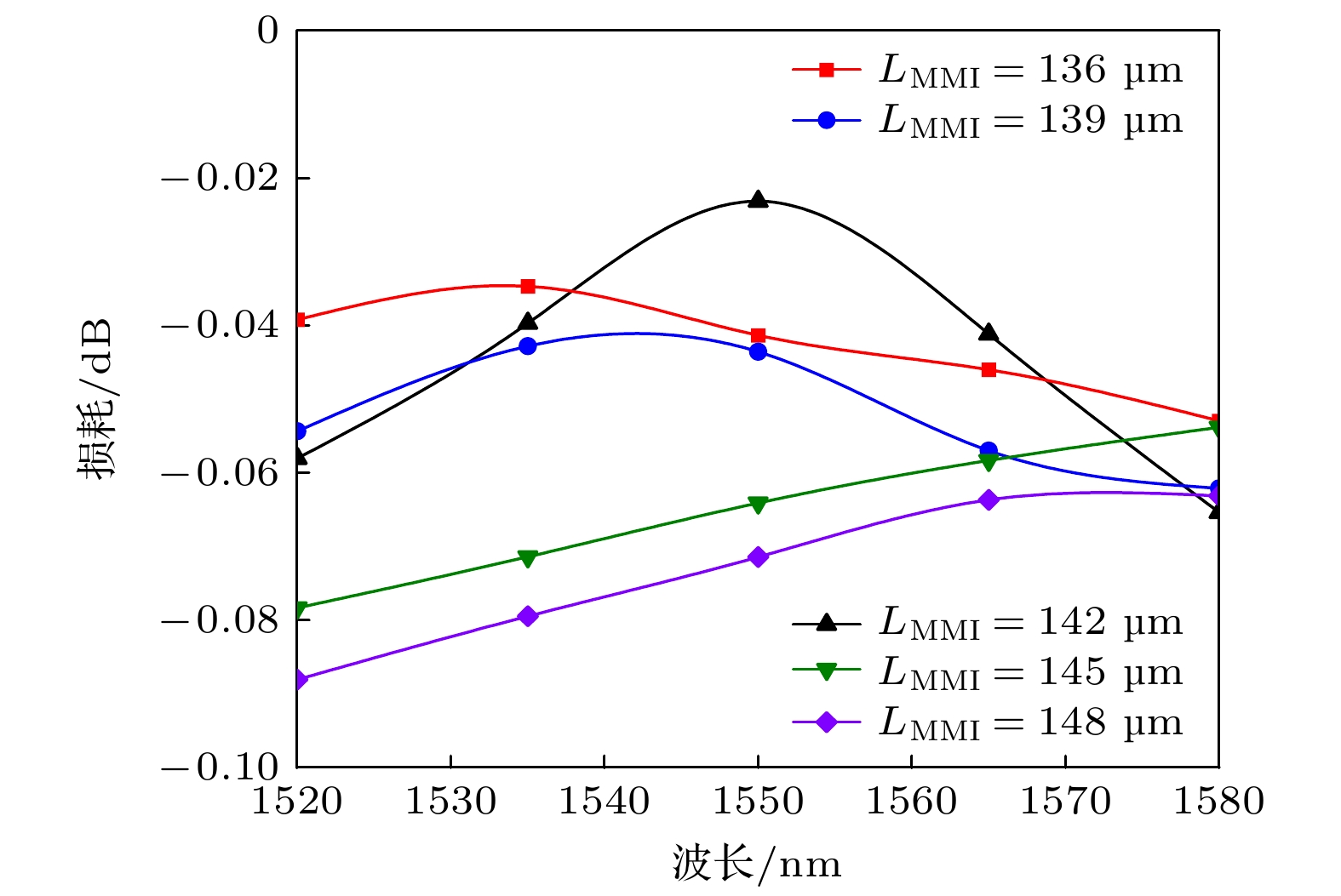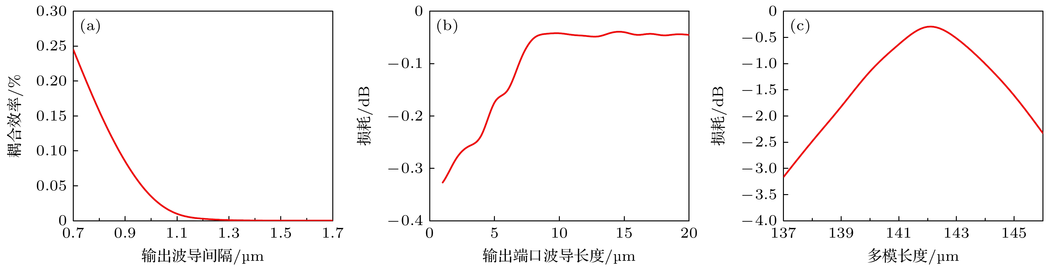 图 2 性能随结构参数变化曲线 (a) 耦合效率随输出波导间隔gap_ln的变化; (b) 损耗随输出端波导长度Lout-ln的变化; (c) 损耗随多模波导长度LMMI的变化