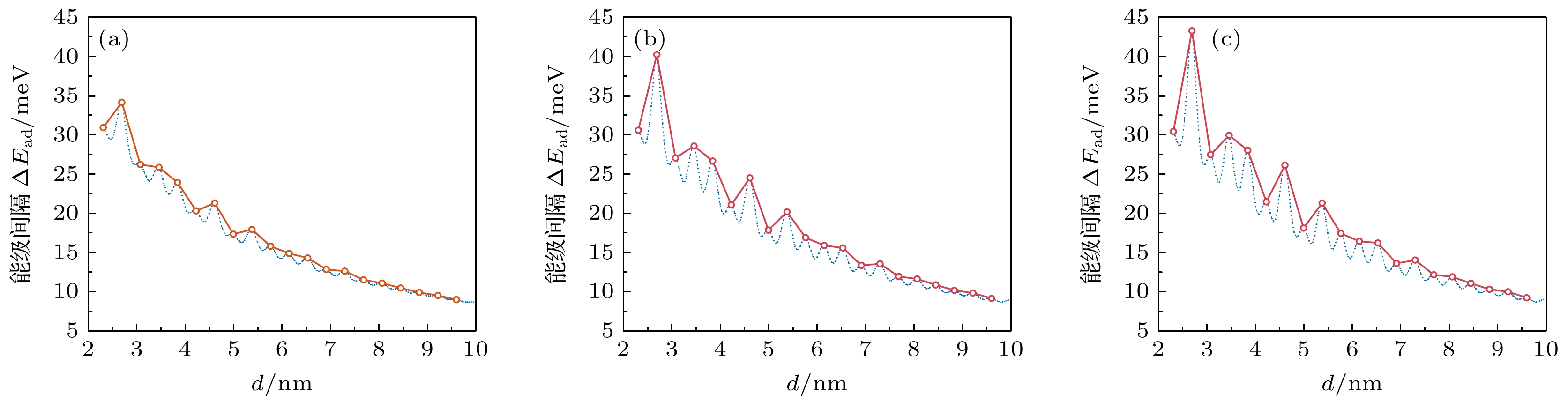 图 10 电子添加能能级间距(电导子峰间距)$\varDelta {E_{{\text{ad}}}}$随最近邻杂质原子间距d的变化关系 (a) NNH模型; (b) NNNH模型; (c) LRH模型