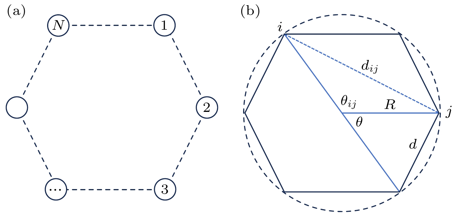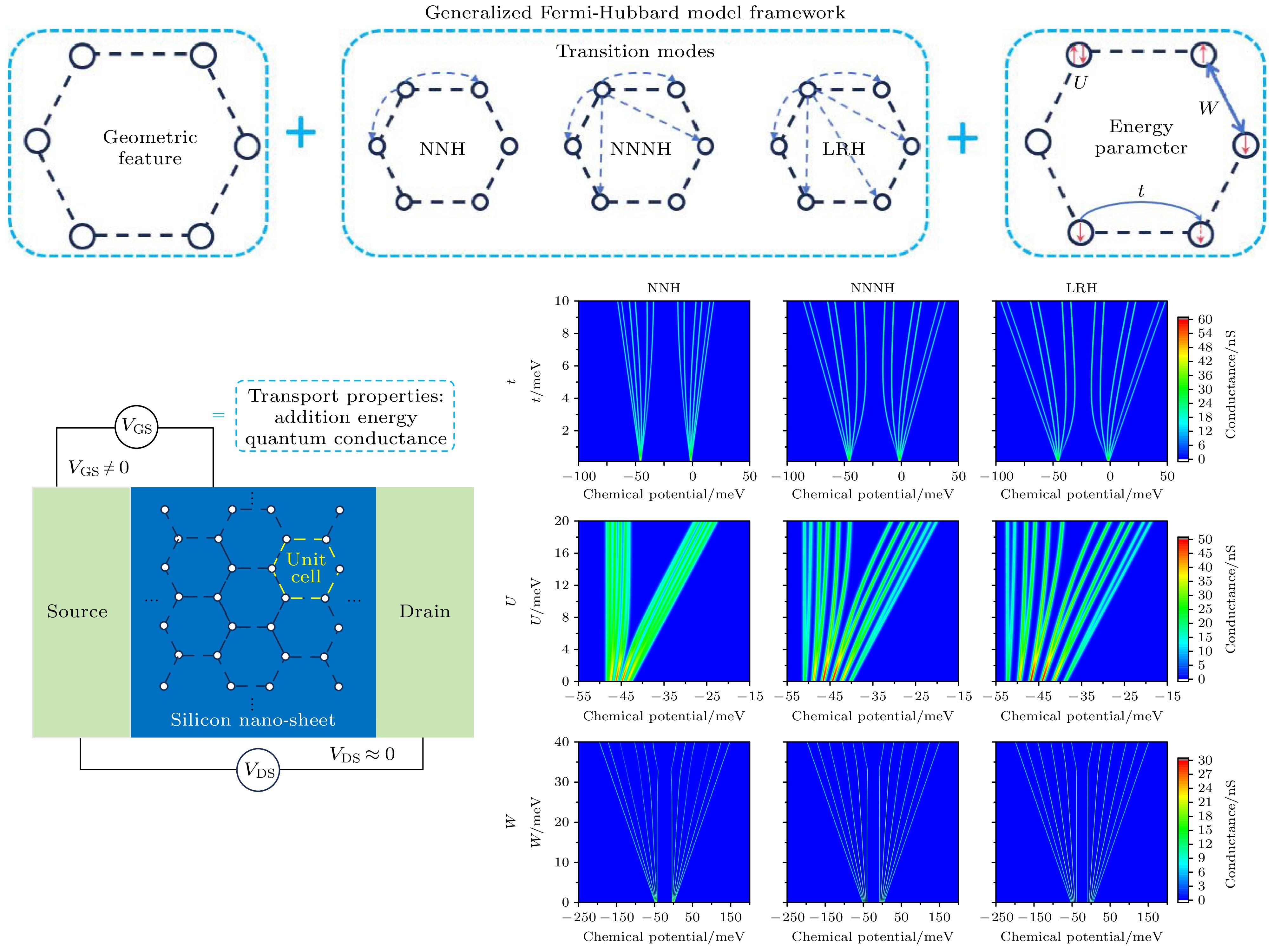 硅基纳米结构中杂质原子量子点阵列因其在量子计算、量子模拟等领域的巨大应用潜力而备受关注. 基于线形、环形和网状等不同几何结构排列的量子点阵列因拓扑特性的差异以及长程库仑相互作用的影响, 展现出各异的电子输运特性. 同时, 通过调控电子隧穿和波函数相位相干性, 可以深刻影响电子的跃迁输运行为. 本文致力于构建硅基纳米结构中杂质原子量子点阵列的通用Fermi-Hubbard模型, 探讨量子点分布的几何构型对电子的跃迁输运行为的调控机制. 特别以环形量子点阵列为例, 深入分析了不同几何结构和电子跃迁模式下的电子添加能谱与电导特性, 揭示了在位电子库仑排斥能、位间电子库仑排斥能、电子-离子实长程库仑吸引能与量子点耦合对电子跃迁行为的影响, 为理解量子点阵列几何分布对跳跃电子输运特性的调控机制提供了基本理论框架.