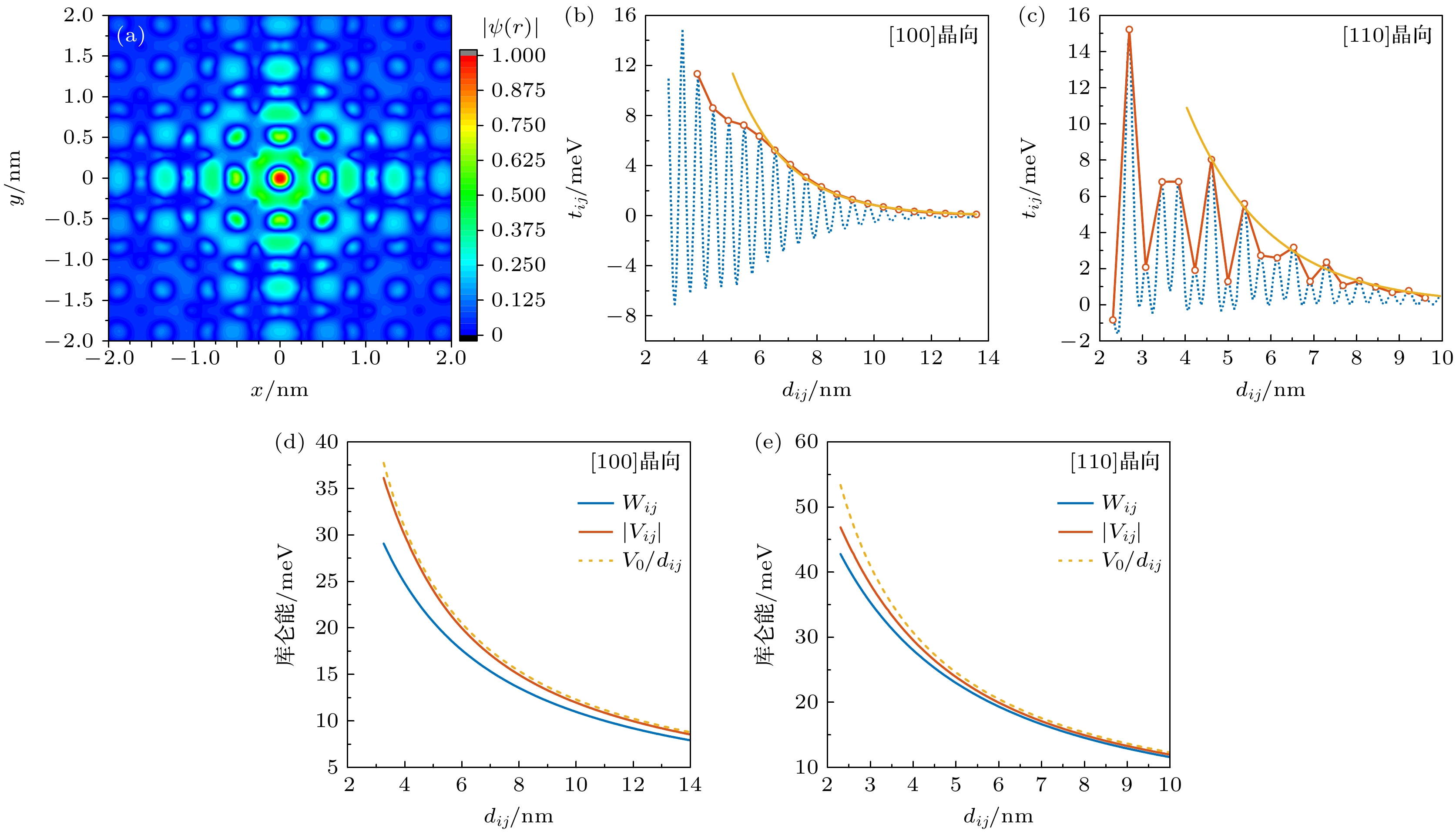 图 3 (a) 束缚在硅中孤立P杂质原子上的电子基态1sA1多谷耦合波函数; (b) 沿[100]晶向排列的杂质原子的耦合强度tij随杂质原子间间距dij的关系; (c) 沿[110]晶向排列的杂质原子的耦合强度tij随杂质原子间间距dij的关系; (d) 沿[100]晶向排列的杂质原子的长程库仑吸引能Vij位间电子排斥能Wij随杂质原子间间距dij的关系; (e) 沿[110]晶向排列的杂质原子的长程库仑吸引能Vij位间电子排斥能Wij随杂质原子间间距dij的关系