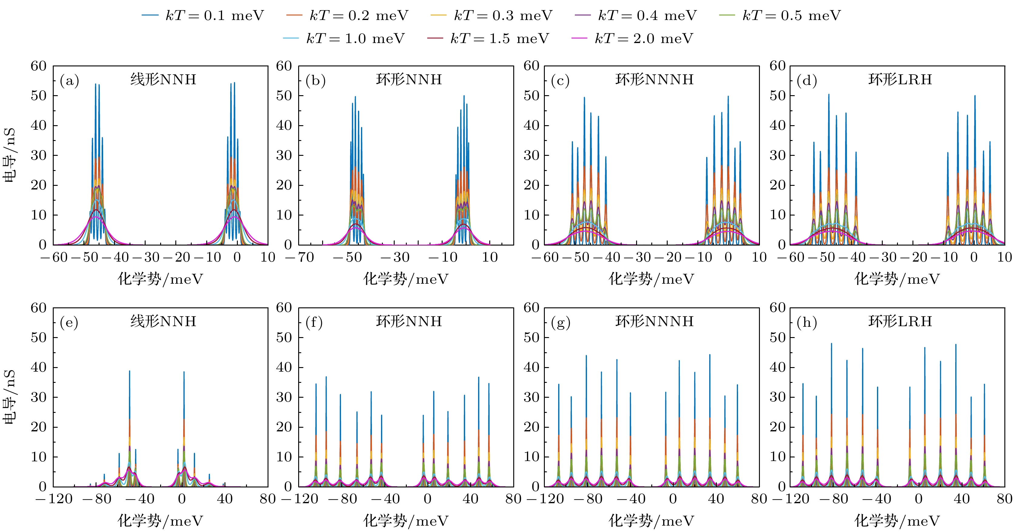 图 9 不同杂质原子阵列的温度依赖的电导特性 (a)—(d) 无位间电子排斥能和长程库仑吸引能体系; (e)—(h) 存在位间电子排斥能和长程库仑吸引能体系; (a), (e) 仅存在最近邻跃迁的一维阵列; (b), (f) NNH环形阵列; (c), (g) NNNH环形阵列; (d), (h) LRH环形阵列