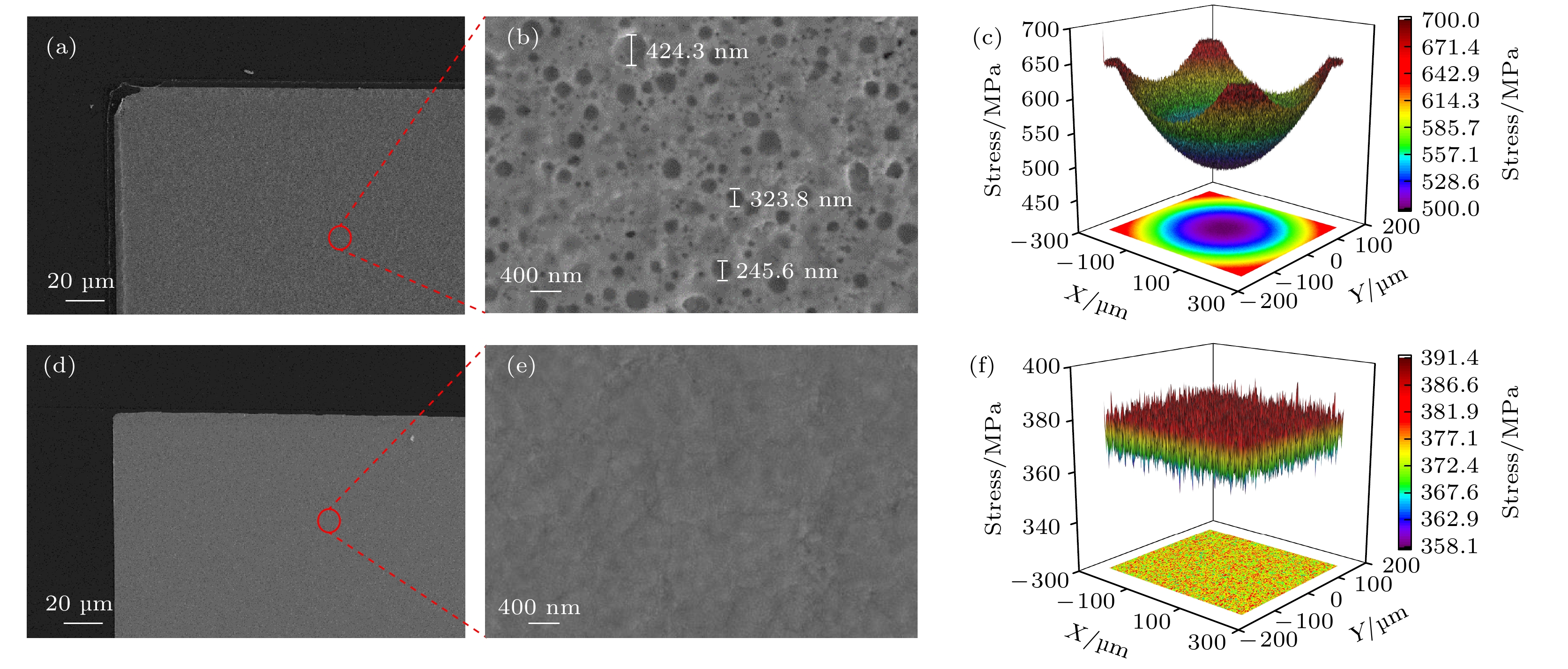Fig. 3. (a), (b) Surface morphology of SiC/Ti/TaSi2/Pt after high-temperature annealing; (c) electrode stress distribution of SiC/Ti/TaSi2/Pt after annealing; (d), (e) surface morphology of SiC/Ti/TaSi2 deposited Pt after annealing; (f) electrode stress distribution of SiC/Ti/TaSi2 deposited Pt after annealing.