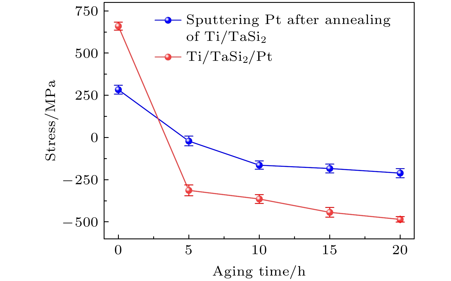 高温高压下硅基设备因自热效应漏电及形变, 无法长期稳定工作. 碳化硅作为第三代半导体在高温高频场景优势显著, 但其4H-SiC器件极限高温性能瓶颈源于欧姆电极与金属互连稳定性, 当前引线电极存在输出不稳定问题, 高温下氧气侵入易致输出失效. 研究在SiC/Ti/TaSi2/Pt欧姆接触基础上, 提出分批次溅射退火工艺制备耐高温引线电极, 通过改变退火与溅射顺序, 先在SiC衬底溅射Ti/TaSi2并退火形成欧姆接触, 再沉积Pt保护层, 构建新型SiC/Ti/TaSi2/Pt电极结构. 分批次溅射后退火形成的电极结构更致密, 600 ℃高温老化实验表明, Ti/TaSi2形成欧姆接触后溅射Pt的电极电学性能更稳定, 即初始比接触电阻率为6.35×10–5 Ω⋅cm2, 20 h空气老化后仍保持欧姆特性; Pt可有效抑制原子扩散和氧化反应使其电极微观形貌平整无卷曲. 分批次溅射退火工艺能显著提升SiC欧姆接触综合性能, 对其他金属组合欧姆接触的结构优化、稳定性提升及应用拓展具有重要指导意义, 为开发热稳定性强、适应复杂环境的欧姆接触提供思路.Under high temperature and pressure conditions, silicon-based devices experience leakage and deformation due to the self-heating effect, making them unable to operate stably for a long time. Silicon carbide (SiC), as a representative third-generation semiconductor material, is an ideal option for high-temperature, high-frequency, and high-power electronic devices. However, the high-temperature performance limitations of 4H-SiC devices stem from the stability of ohmic contact electrodes and metal interconnections. The output of the lead electrodes is unstable at present, and oxygen intrusion at high temperatures can easily cause output failures. Previous studies indicate that the SiC/Ti/TaSi2/Pt multilayer structure holds significant potential for ohmic contacts. Building upon this ohmic contact foundation, this study proposes a batch sputtering-annealing process to prepare high-temperature-resistant lead electrodes. This involves altering the sequence of annealing and sputtering: first sputtering Ti/TaSi2 onto the SiC substrate and annealing to form the ohmic contact, followed by depositing a Pt protective layer to construct a novel SiC/Ti/TaSi2/Pt electrode structure. Comparative analysis of the two experimental groups is conducted using SEM, AES, XRD, thin-film stress measurement, and semiconductor analyzers. The batch-sputtered and annealed electrode structure can enhance density and reduce residual stress, with an initial specific contact resistivity of 6.35 × 10–5 Ω·cm2. High-temperature aging tests at 600 °C demonstrates superior electrical stability for electrodes formed by sputtering Pt onto Ti/TaSi2 after ohmic contact formation. These electrodes maintain ohmic characteristics even after 20-hour air aging, whereas traditional co-sputtered ohmic contacts transition to Schottky contacts. Pt effectively suppresses atomic diffusion and oxidation reactions, resulting in a smooth electrode microstructure without curling. The batch sputtering-annealing process not only greatly enhances the overall performance of SiC ohmic contacts but also provides crucial guidance for realizing the structural design and performance improvement of ohmic contacts by using other metal combinations. This approach holds significant reference value for the high-temperature packaging of third-generation semiconductor power devices and the development of electronic systems operating in harsh environments.