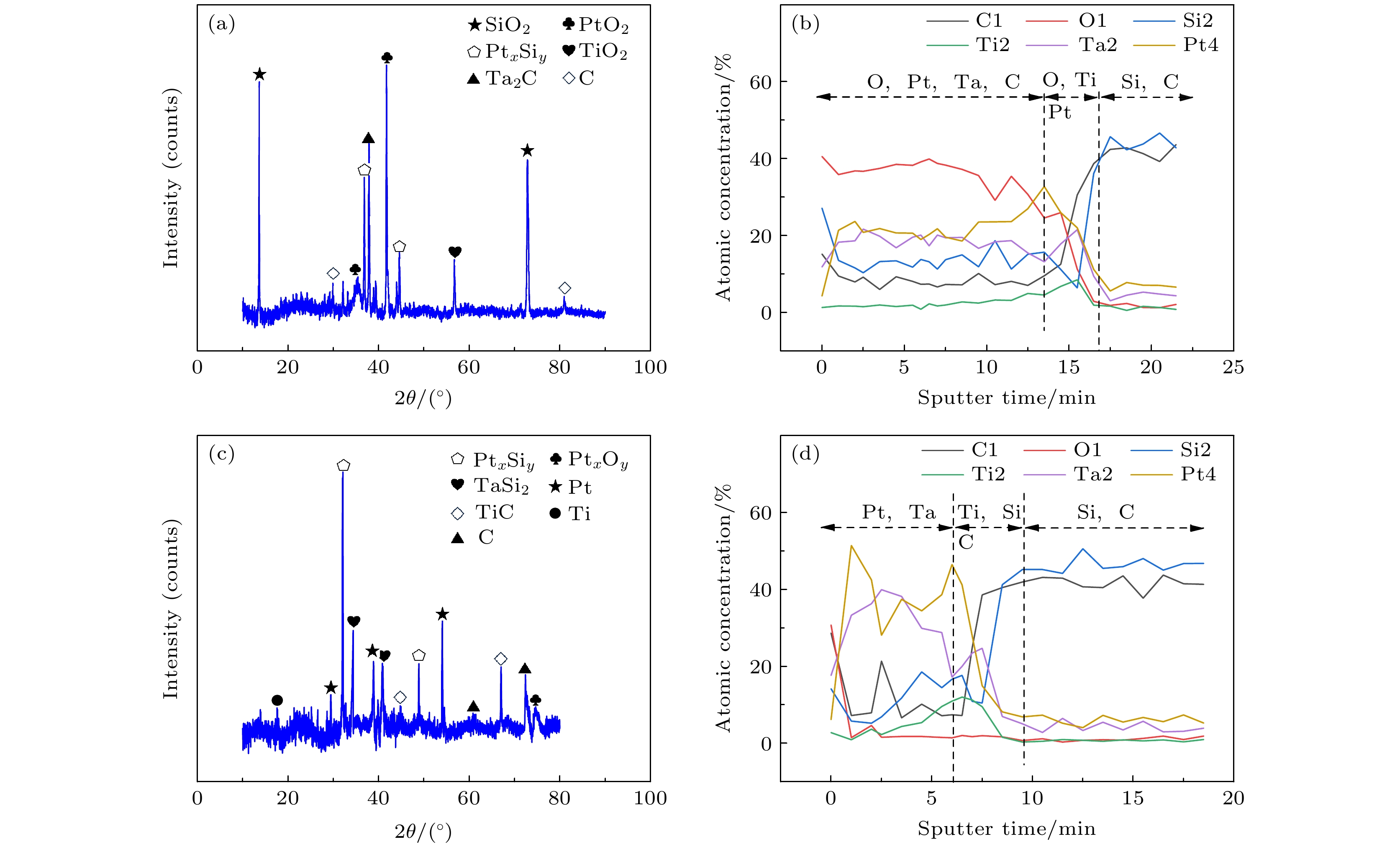 图 7 (a) Ti/TaSi2/Pt共溅射退火老化20 h后的XRD分析;(b)Ti/TaSi2/Pt 共溅射退火的AES分析; (c)分批次溅射退火老化20 h后的XRD分析; (d)分批次溅射退火的AES分析