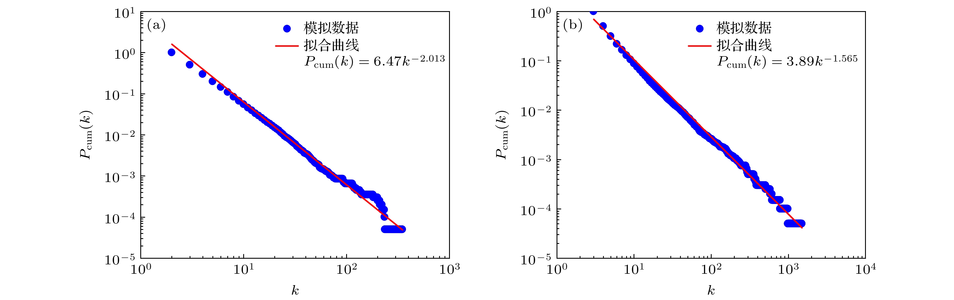 图 2 模型的累积度分布与回归曲线, 横轴是度, 纵轴是累积度分布$ {P}_{\mathrm{c}\mathrm{u}\mathrm{m}}\left(k\right) $ (a) $ d=2, m=1 $时模型的累积度分布与回归曲线, 回归曲线的相关系数$ R=-0.9825 $, 幂律指数$ \tau =2.013 $; (b) $ d=3, m=1 $时模型的累积度分布与回归曲线, 回归曲线的相关系数$ R=-0.9934 $, 幂律指数$ \tau =1.565 $