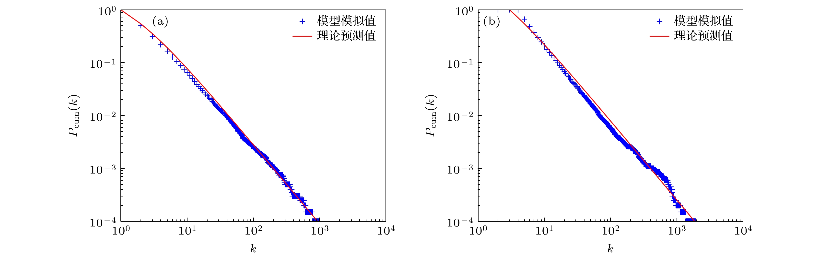 图 3 $ d=2 $时模型的累积度分布与理论预测曲线. 横轴是度, 纵轴是累积度分布$ {P}_{\mathrm{c}\mathrm{u}\mathrm{m}}\left(k\right) $, 蓝色+表示模型的模拟值, 红色实线对应于方程(5)给出的理论预测值, 幂律指数为$ \tau =2 $ (a) $ m=1 $时模型的累积度分布模拟值与理论预测曲线; (b) $ m=2 $时模型的累积度分布模拟值与理论预测曲线