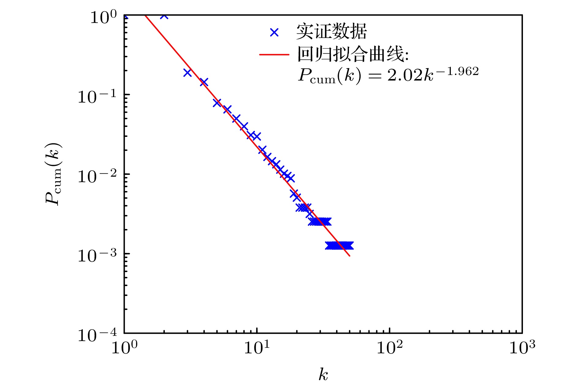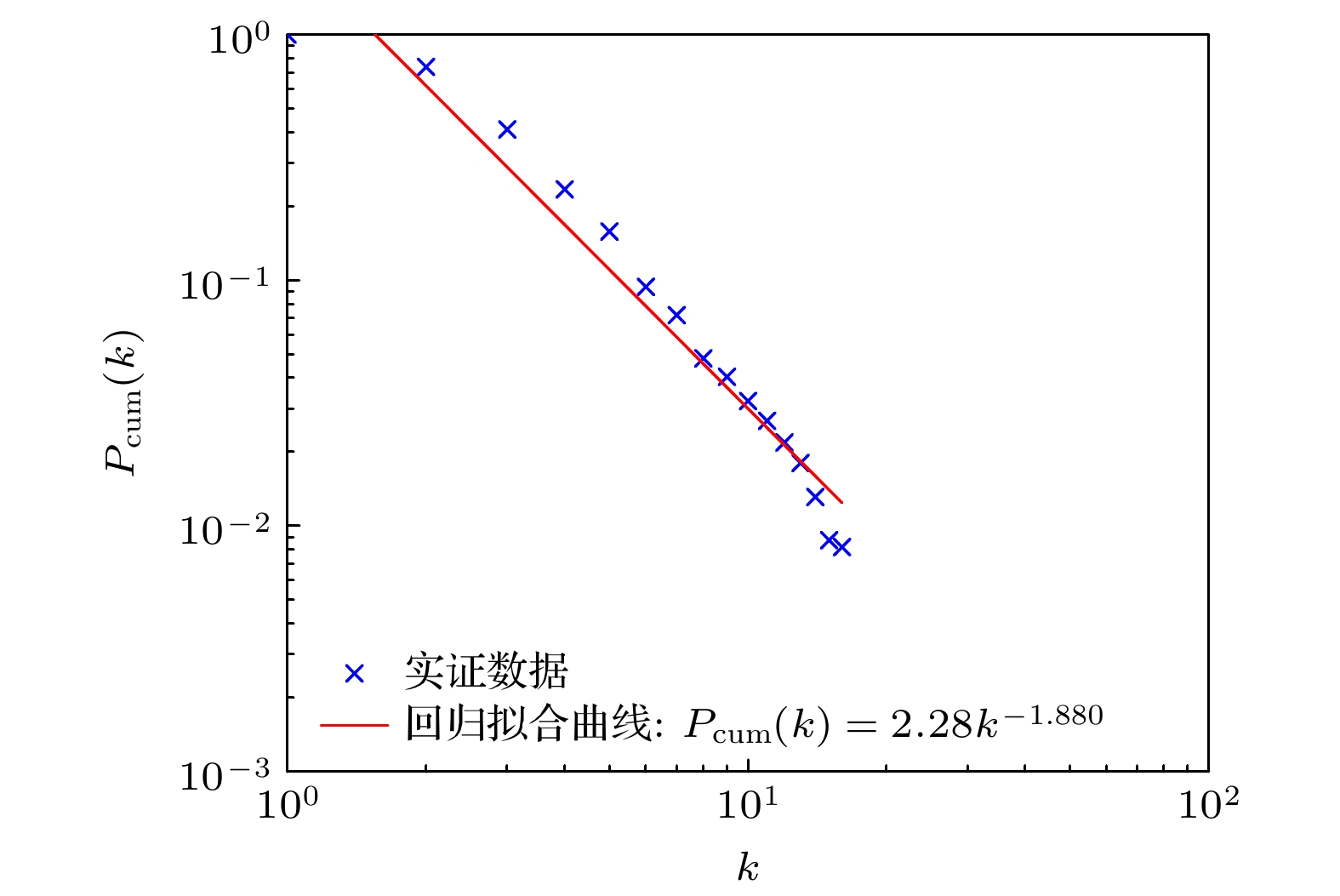 图 6 下秩3的科学家合作超网络累积度分布. 网络规模N = 1830, 蓝色叉表示下秩3的科学家合作超网络累积度分布. 红色实线表示回归拟合曲线, 相关系数$ R= -0.9766 $, 累积度分布的幂律指数$ \tau =1.88 $