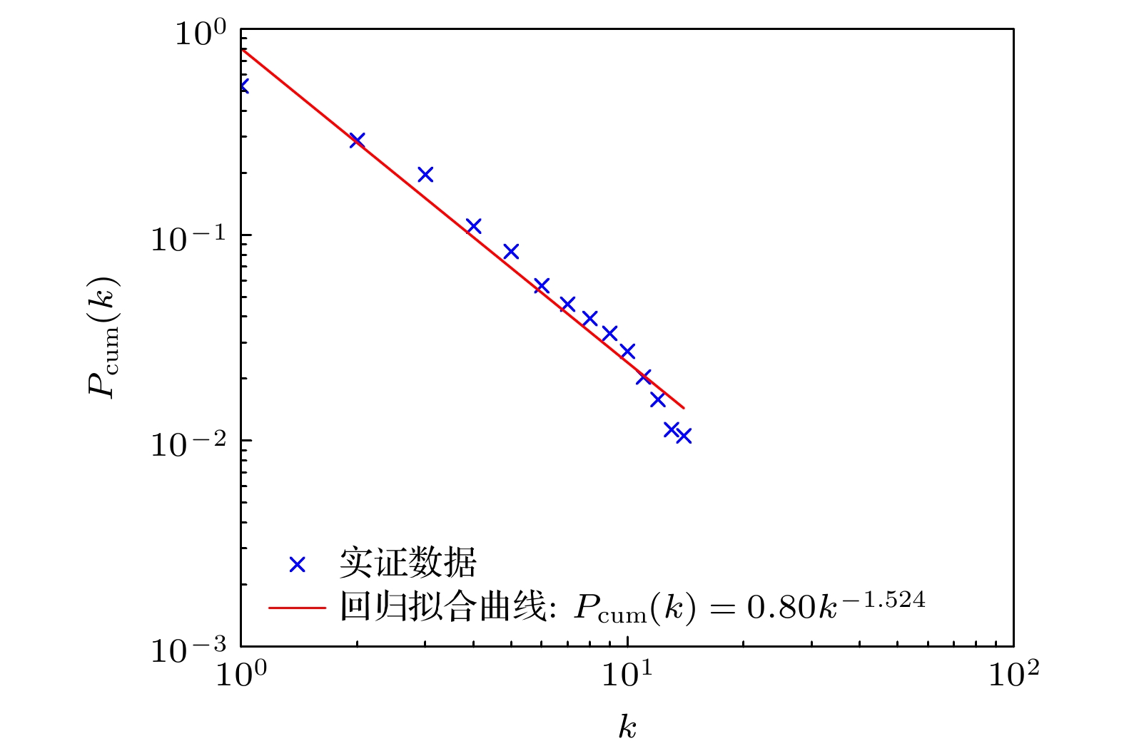图 7 下秩4的科学家合作超网络累积度分布. 网络规模N = 1342, 蓝色叉表示下秩4的科学家合作超网络累积度分布, 红色实线表示回归拟合曲线, 相关系数$ R= -0.9833 $, 累积度分布的幂律指数$ \tau =1.524 $
