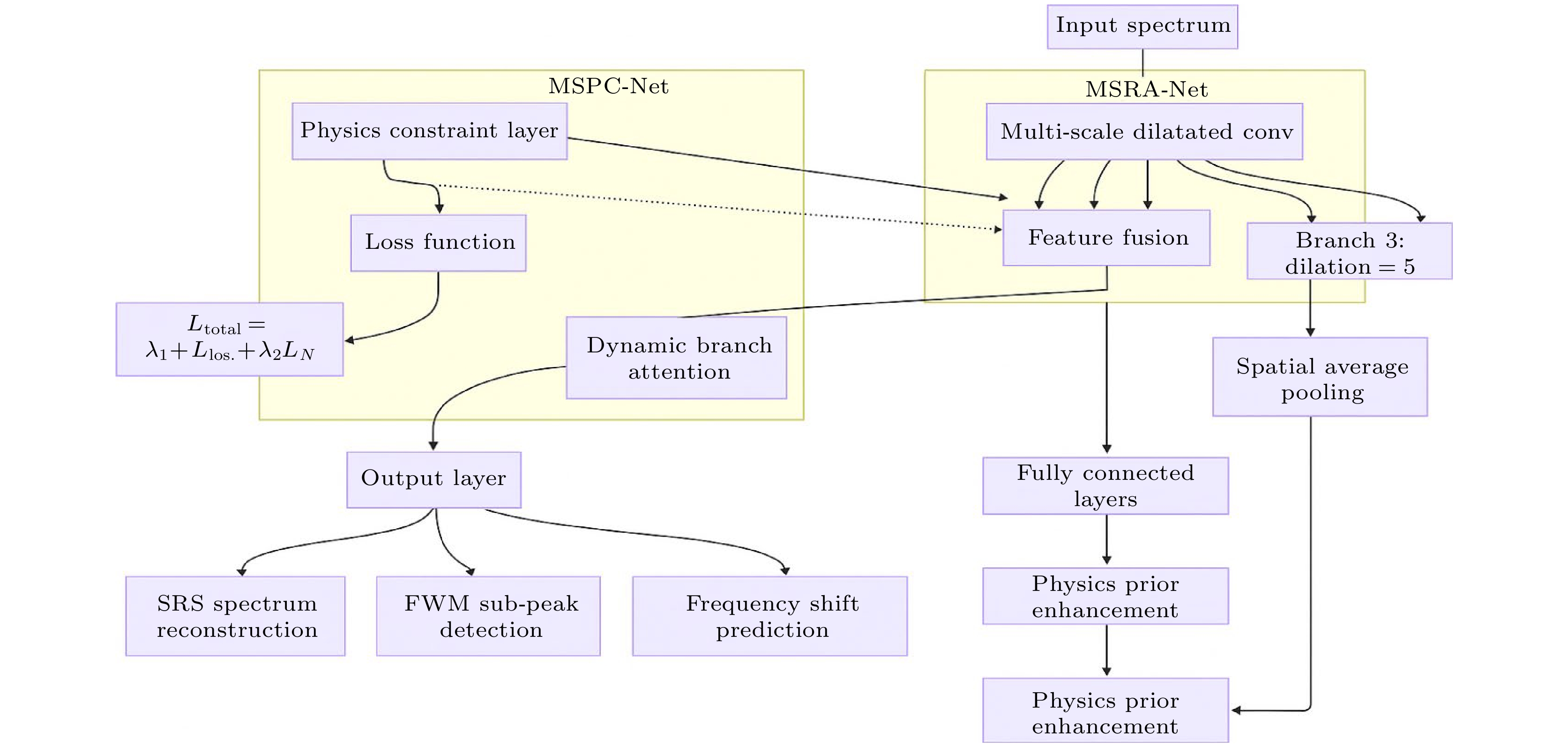 针对单模光纤中四波混频-受激拉曼散射(FWM-SRS)强非线性耦合效应难以解析的问题, 本文提出了一种融合物理机理与神经网络的多尺度物理约束网络(MSPC-Net). 该模型通过将非线性薛定谔方程(NLSE)的频域残差作为物理约束项嵌入网络优化过程, 并设计多尺度空洞卷积模块融合局部细节、中程展宽及长程衰减特征, 实现了光谱成分分离与物理参数的联合高精度反演. 在250 m与500 m单模石英光纤实验中, MSPC-Net重建斯托克斯光谱的均方根误差(RMSE)分别低至0.014与0.0173, 较传统卷积神经网络降低超68%; 其频率偏移预测的平均绝对误差分别为0.03 nm和0.04 nm, 精度较现有方法提升约90%. 在信噪比(SNR)为6 dB的噪声环境下, MSPC-Net对FWM次峰信息的检测正确率高达95.3%, 伪峰率低于4.7%. 模型得益于物理约束的引导及轻量化结构设计, 在SNR = 15 dB噪声下RMSE增幅仅9.8%, 并具备良好的实时处理能力, 可部署于嵌入式设备, 为高功率光通信系统优化与分布式光纤传感提供高效解决方案. 本研究通过将严格物理规律与多尺度特征提取相结合, 有效解决了长距离光纤复杂非线性效应的解析难题, 显著提升了预测结果的理论符合度与噪声鲁棒性.