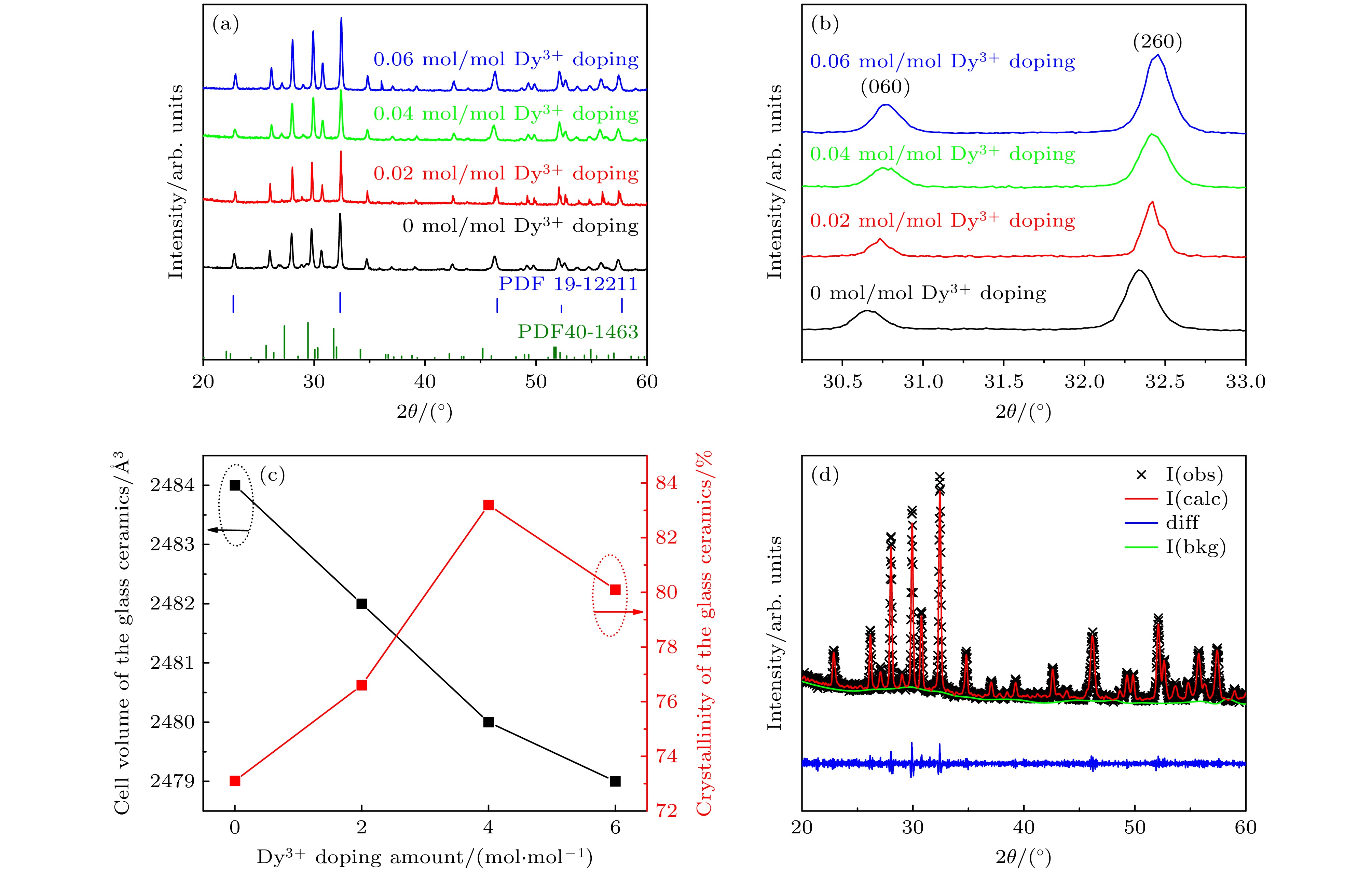 图 1 不同摩尔浓度Dy3+掺杂BaO-Na2O-Nb2O5玻璃陶瓷的(a) XRD图谱、(b) XRD局部放大图、(c) 晶胞参数和结晶度; (d) Dy3+掺杂浓度为0.04 mol/mol BaO-Na2O-Nb2O5玻璃陶瓷的XRD精修全谱拟合图